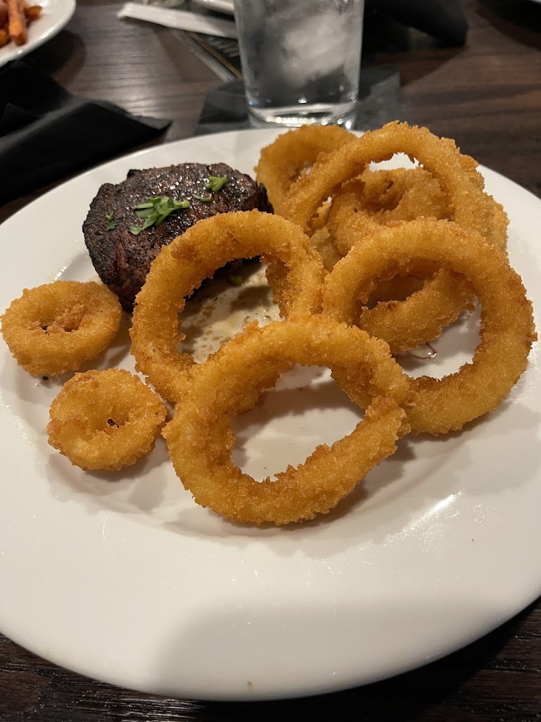 The cleanest restaurant I have visited in a while! Service was friendly and fast. They could accommodate special requests. The filet was pretty good. The street crown was delicious. The onion rings were very hard.