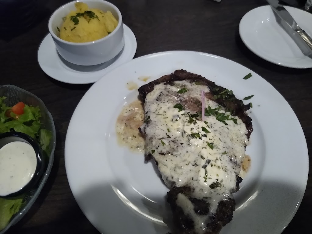The food was delicious. Steak was cooked well and the garlic mashed potatoes were creamy and flavorful. It was a busy Friday night, and they just opened so there were a few small things that happened with the service, but they were quickly remedied. Definitely will go back.