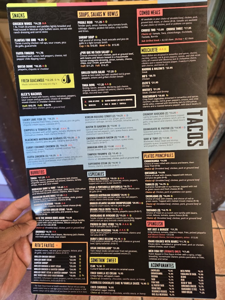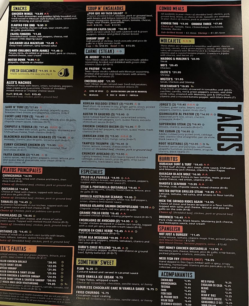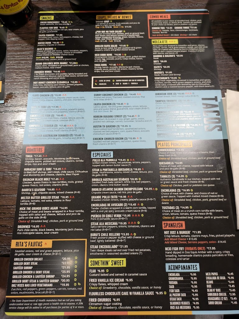 We enjoyed the combo platters, tacos/tostada/enchiladas with rice and beans. The margaritas were good, especially the skinny margarita. The dessert sampler was delish as well. Update:: steak and shrimp fajitas order, only recd steak, margarita no salt order, got with salt. Not very busy, expected better.