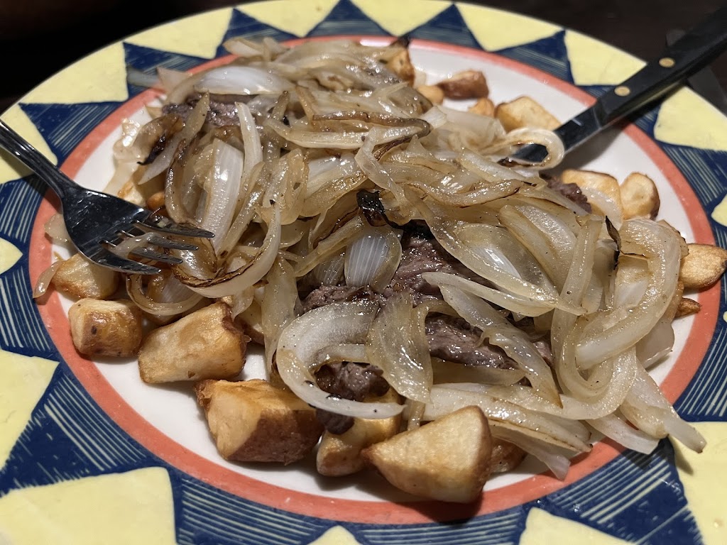 For $22 you get 2-3 oz of steak and a whole plate is peppers and onions .