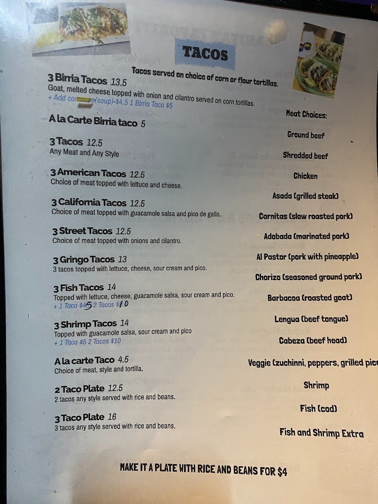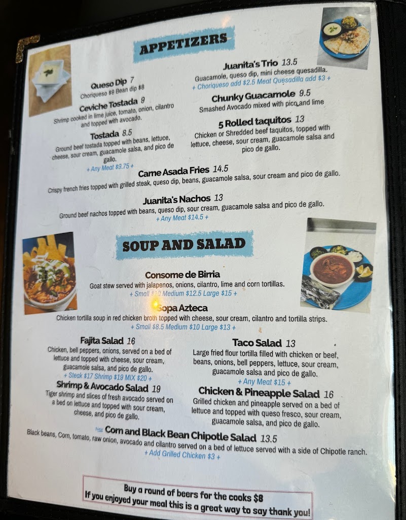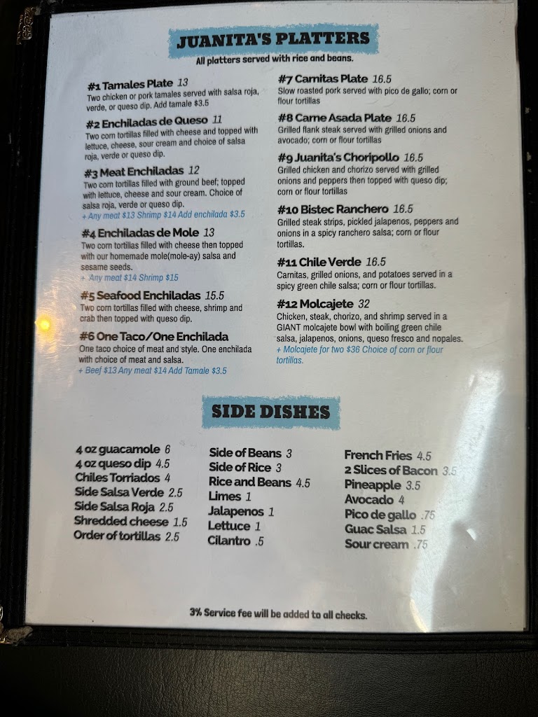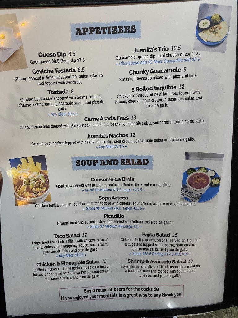 When I went to this establishment based on googles directions, it's a dance place of some sort now. I read the previous comment about being charged for birra and this sounds like California Taco? Not sure what is what but Juanitas is not at this location anymore.