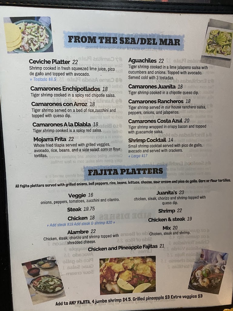 Good: we ordered the Juanita’s chimichanga plate and the Fajita Bowl. Very mild not much taste. We’ve had much better Mexican food other places. It took a very long time to receive our food. They filled our chips 3 times before our food was served. We were a table of 4. The chips and salsa were good.