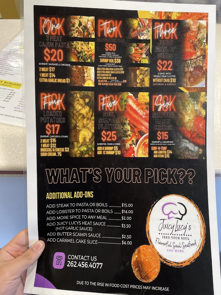 Good customer service. If you are visiting Racine, or you have a taste for some good food, sea food, Juicy Lucy’s Kitchen is a must.