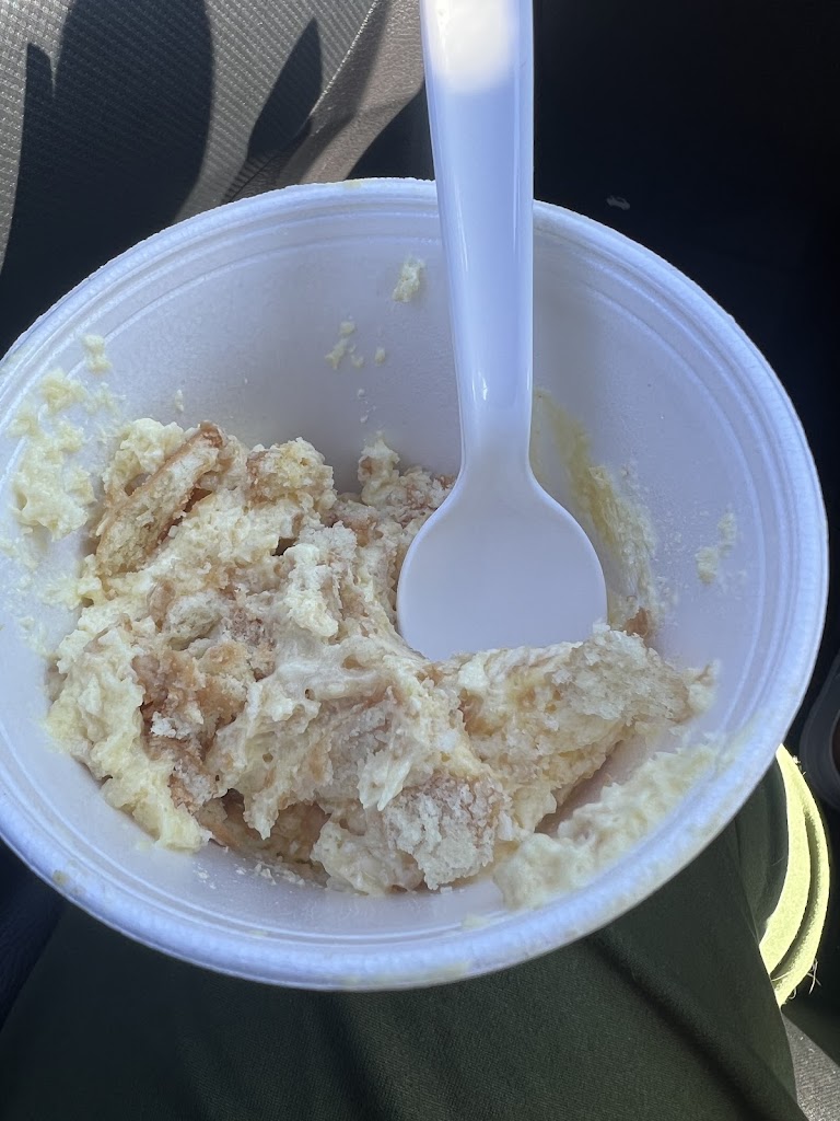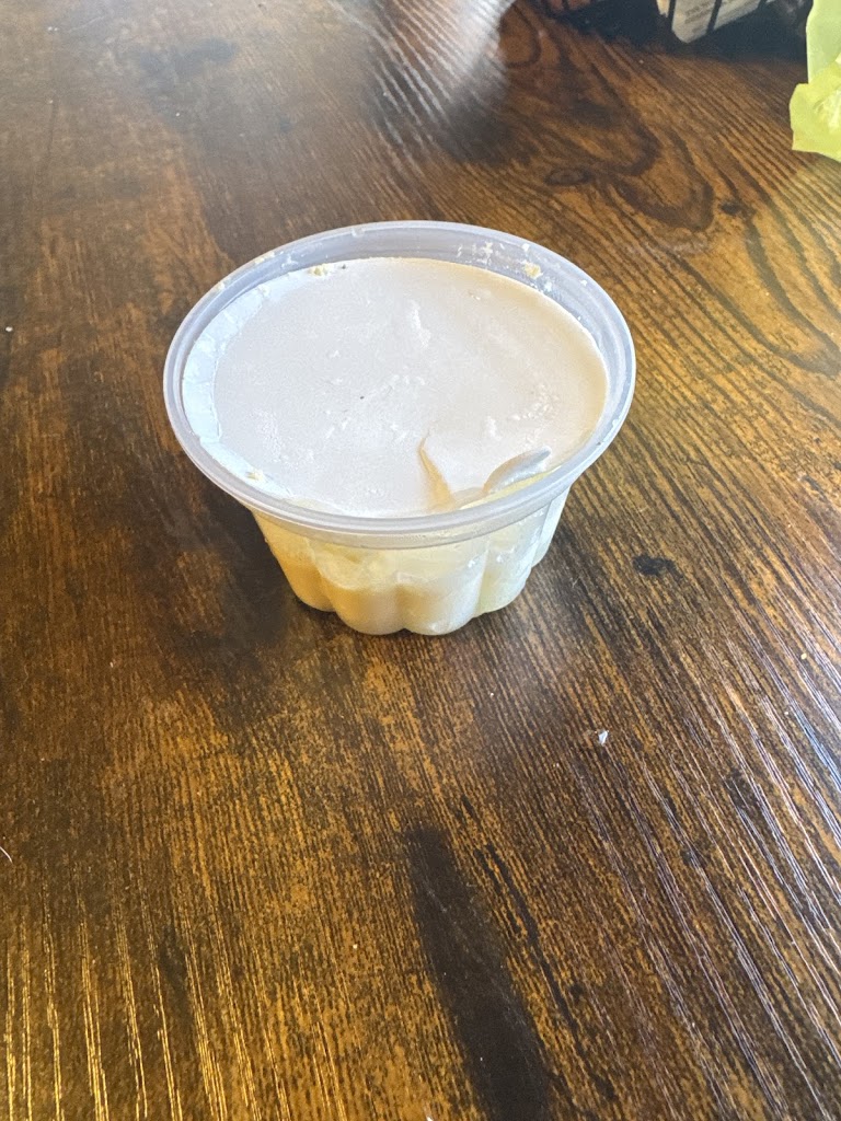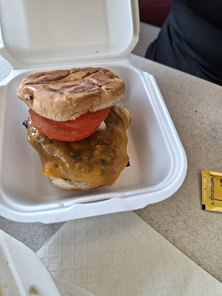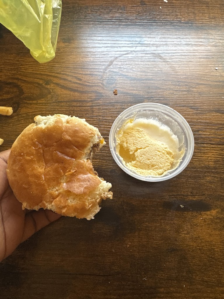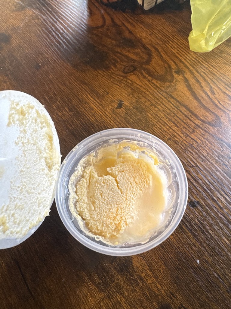 Order the California burger from Uber eats with a side of fries and peach cobbler with ice cream. The Burger was way smaller than expected, and it didn't even come with any of the Leto,tomatoes,onions they It said it was on there. I didn't much mind too much about that, but my biggest issue was when I looked at my ice cream. I found out that it was already pre-opened and half eaten. Using ice cream for size comparison