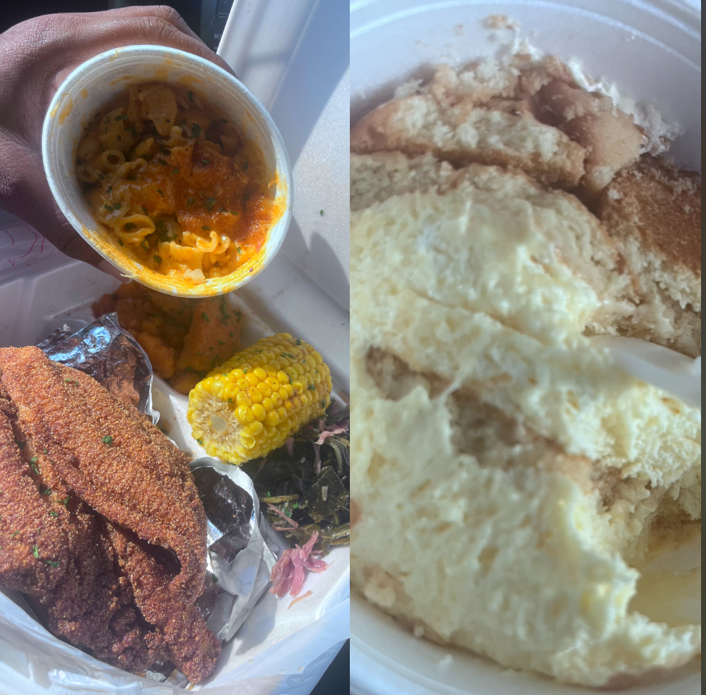 My husband ordered via Uber Eats, a catfish & chicken dinner with yams and Mac & cheese as a side. I understand business may sell out of select items. We should have been given a choice of a replacement side. A catfish dinner at 22$ with only ONE catfish filet is crazy ridiculous. The chicken looked as if it was someone’s left overs from 2 nights ago. The macaroni was HORRENDOUS and to be given a double serving of such buffoonery is diabolical! We had to order hot sauce & tartar as condiments.. He even ordered the mystery Koolaid, and it’s a mystery as to why it’s still on the menu. The ONLY edible item was the cornbread, the literal star of the show. Icing on the cake??? The Diet Coke not the regular red bottle! SMH extremely disappointed, 0/10!!!! FIRE THE COOK!!