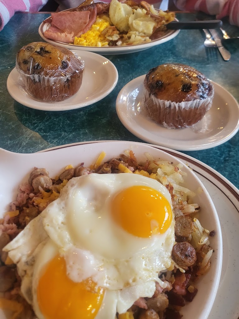 The breakfasts were filling and delicious! We tried the omelet (no pic), skillet, and the farmers country breakfast. Most breakfasts come with either toast, mini-pancakes or a muffin and I'm here to say the muffins are phenomenal! Example is the blueberry one: homemade and loaded with blueberries! Our waitress wrapped ours on the second trip, knowing we wouldn't finish and she was right! Very filling.