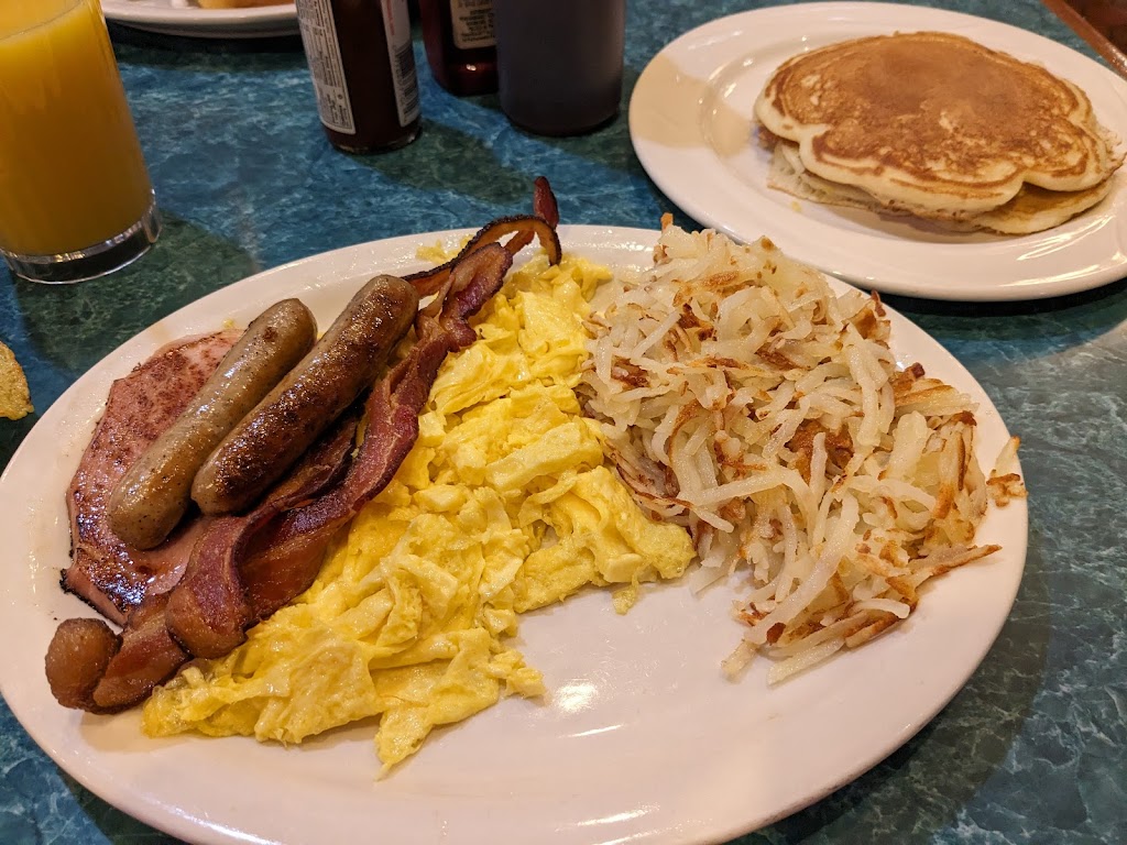 The food was really good. Of our 4 dishes and a cherry pie, 3 food items were 5/5, the pie and the turkey avocado eggs Benedict were 4/5. Very friendly and attentive staff. Portion sizes are HUGE. Very cheap considering the amount of food you get.