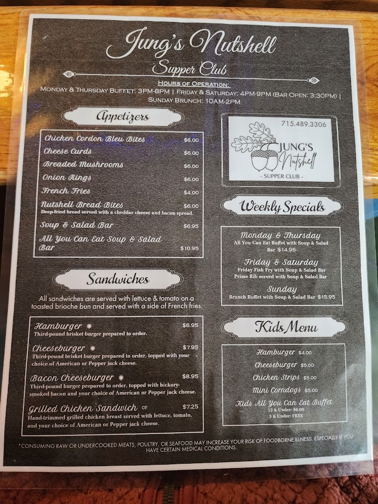 Best steak I have had from.a restaurant ever..Full flavor all the way through the Rib eye Sirloin and Prime rib..its a small place but able to get a family of 6 and a few more families in quickly ..Drinks were excellent and bartender is very pleasant.. They informed us what they were running out of and let everyone else in the bar know at the same time..The specials on Saturday night weren't the standard Prime rib like most Wisconsin supper clubs but they definitely serve a great selection of Steaks... no fluff no frills just all around great food ..Salad bar had an excellent selection to include pickled herring and liver pate.