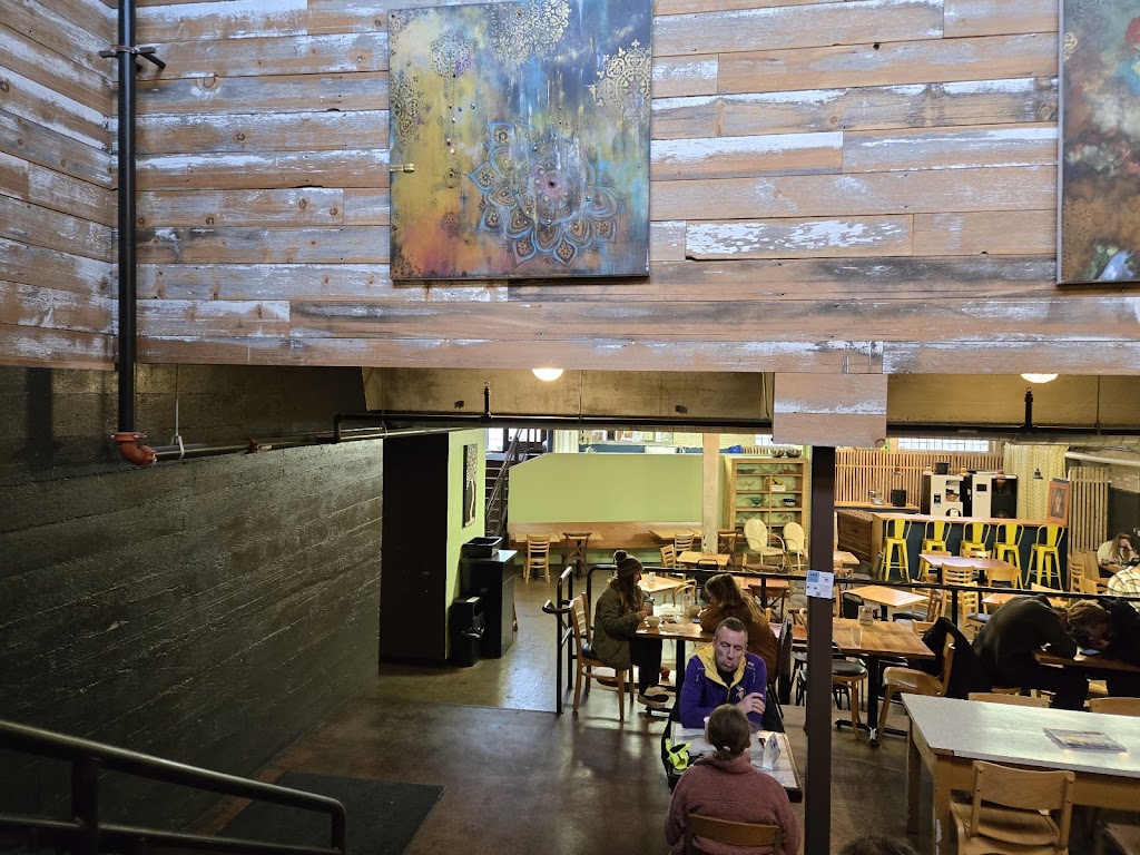 Very large interior, lots of seating. Excellent coffee, vegan treats, and clean bathrooms.