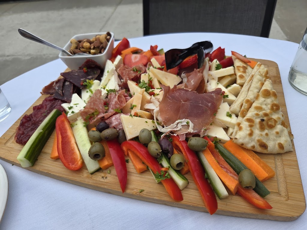The charcuterie board was beautiful and had a great variety of meat and cheese as well as nuts olives and veggie sticks. We brought most of it home.