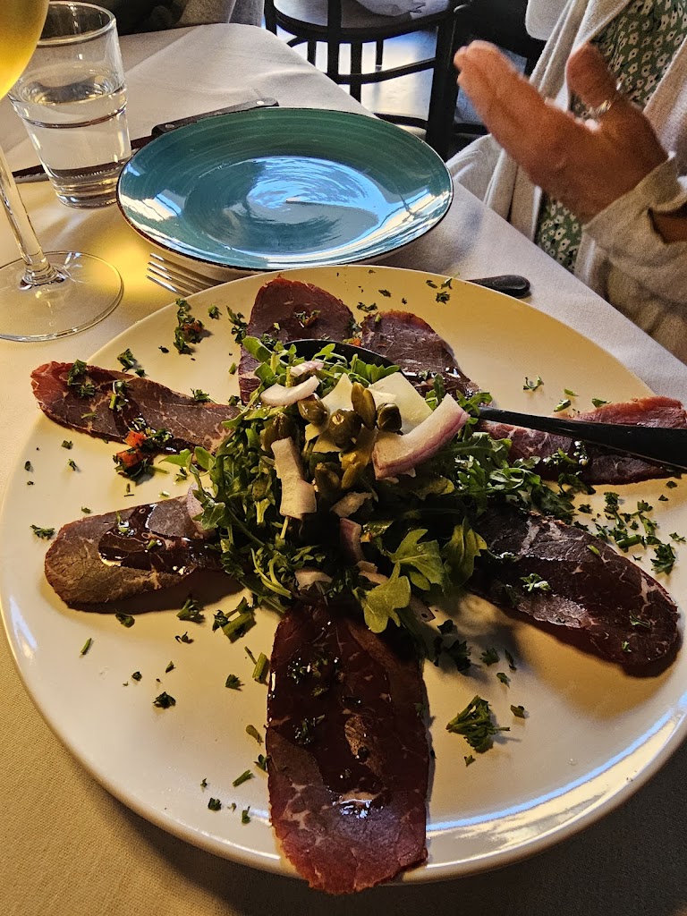 1st time having dinner here. Nice looking restaurant with a good atmosphere, though a bit loud to hold a conversation. Had the smoked “carpaccio”. It’s ok, but not like the carpaccio I’ve ever eaten at other restaurants. It’s not raw beef, so not necessarily carpaccio from my perspective. Had the grilled octopus which was rather good and the scallops with risotto. It was good, but the risotto was a bit salty for my taste. I’d probably go back to try other offerings.