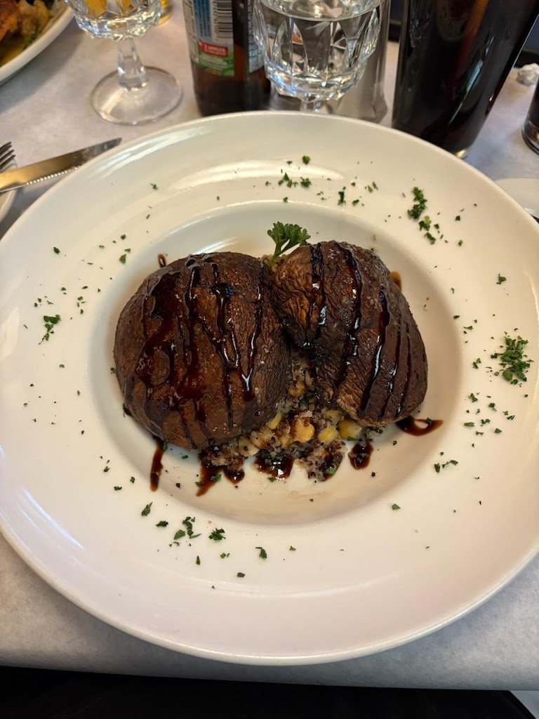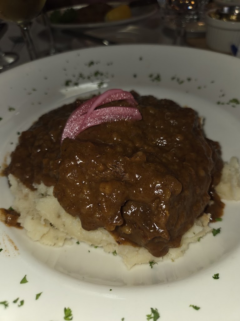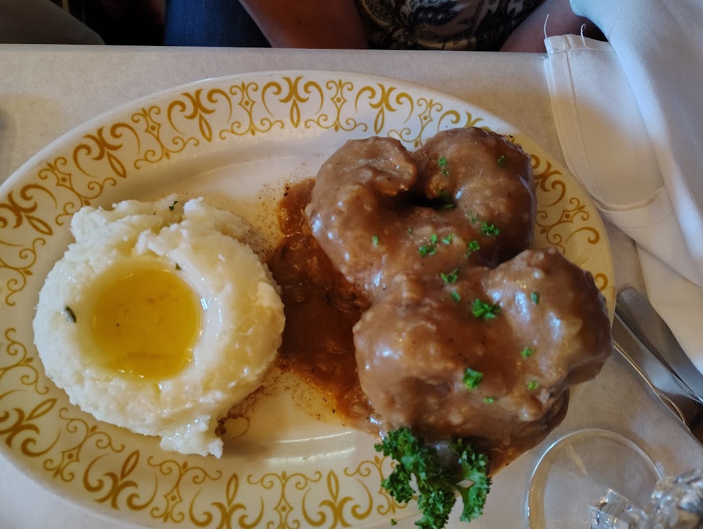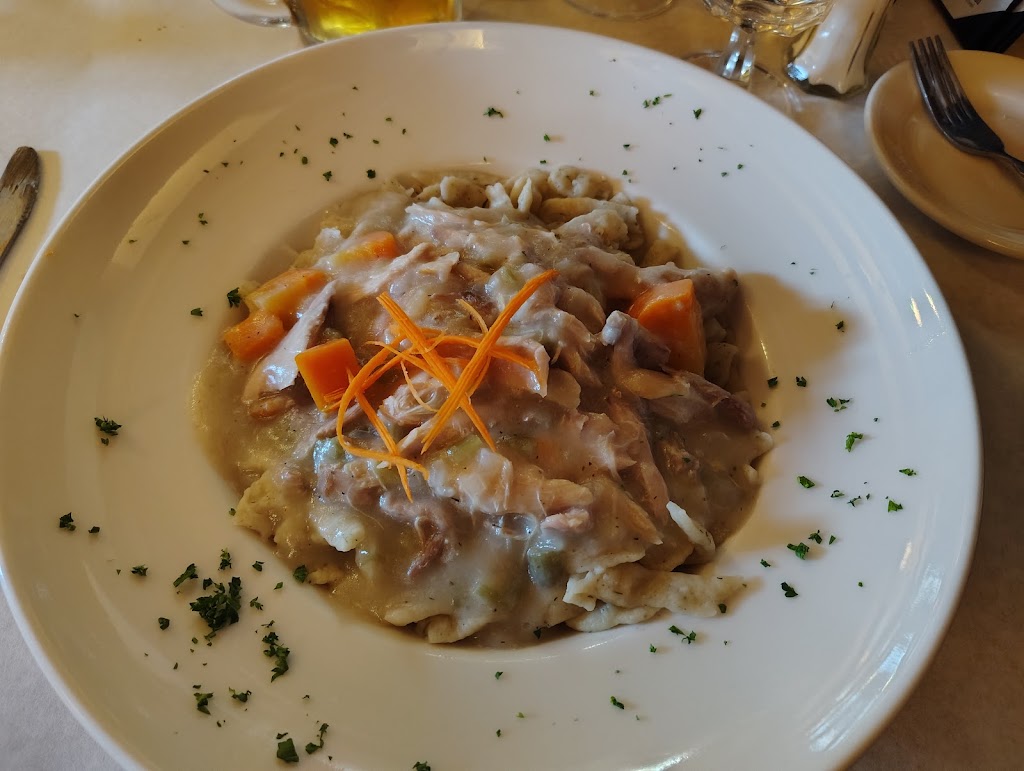 had the Jägerschnitzel, pretty small for the price and only got a little brown gravy on the side with it. I assumed it would had mushrooms in it( like the real stuff in Germany), but it was just brown gray. salad was good. got a dumpling with it. it a Semmelknödel (bread) dumpling, it was pretty dry and they put a little butter over it, but it didn't help. had not enough gravy to dunk it in. daughter had the Rouladen, pretty small, but the taste was good. other daughter had the goulash. for $34 it was a big plate. when paying the bill they come with the handheld and stand right next to you when you pay and tip that's kinda annoying.