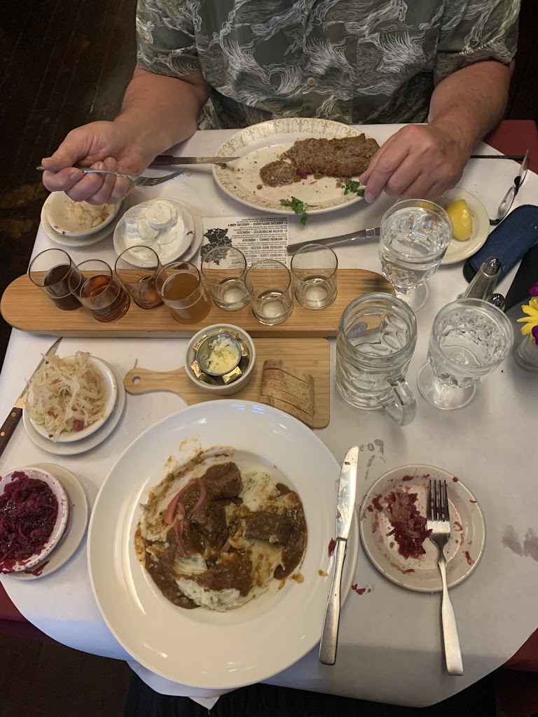 Went here for a birthday dinner. Did. Not. Disappoint. The service was awesome. Laid back and professional. The food surpassed my expectations. The goulash was absolutely fantastic. The beer flight was perfect. The red cabbage was exactly what I wanted. My partner had the schnitzel and loved it. A little something for everyone. The music was A+. Joni Mitchell, steely Dan, Paul Simon, etc. made a huge difference. Strongly recommend this place! We had gone to Maders a few months back and did not like it. This is the place to go for German food.