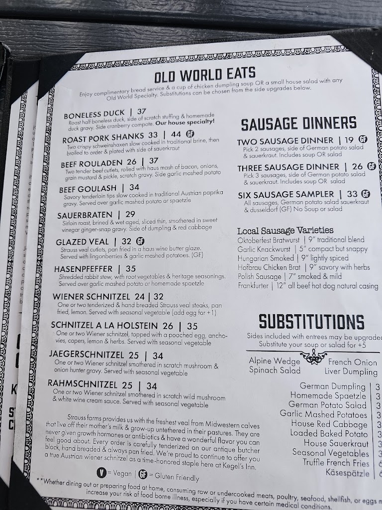 I almost never leave food reviews, but I felt I had to in the case of Kegel's. This was the best German food I've ever had in my 70 years -- including many times in Germany and from my German grandma (sorry grandma!). I've never had saurbraten so moist (how did they do that?); the red cabbage was the perfect blend of sweet and sour; the kraut had just the perfect tang; and I loved the sweet-sour hot potato salad. The architecture and atmosphere both have authentic Olde World charm. An experience not to be missed! (Oh, and the service was perfect!)