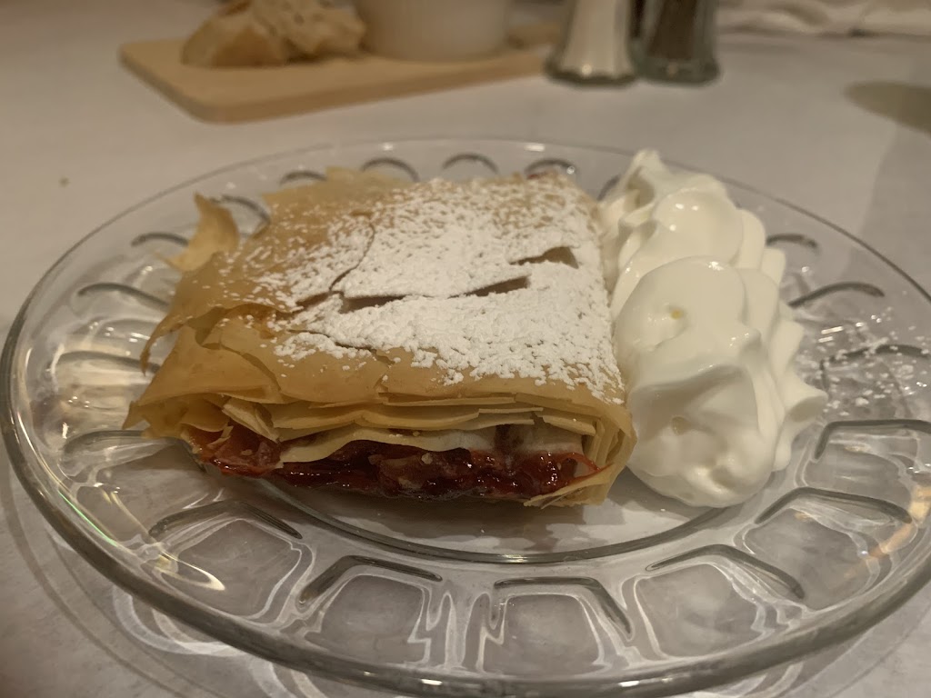 Apple dessert was soggy and brought to us about 30 seconds after ordered which tells me it was probably precut and in hot box.
