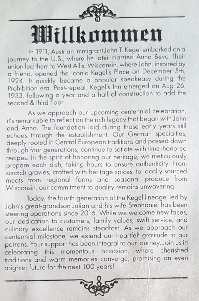 Visited Kegel's for a special event. It was fantastic! Great German heritage atmosphere and history.