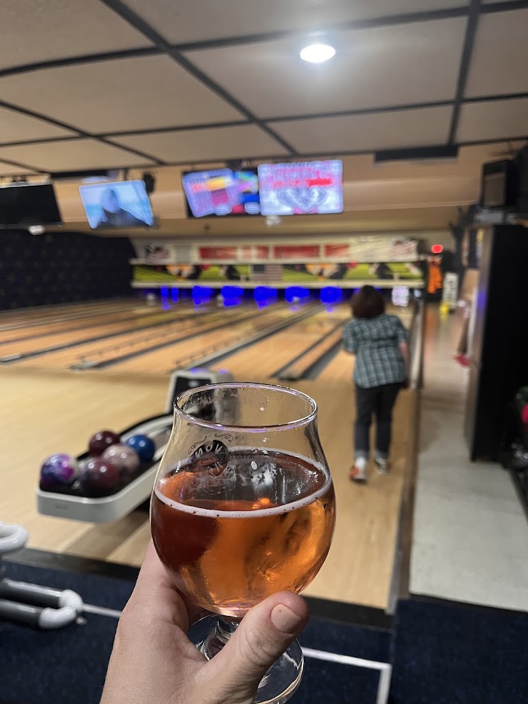 it has amazing pizza and beer but they dont have the best varitery in balls and pins but you can still bowl and have a nice time getten drunk with your faimly and they have a verry nice jukebox and a verry hot worker