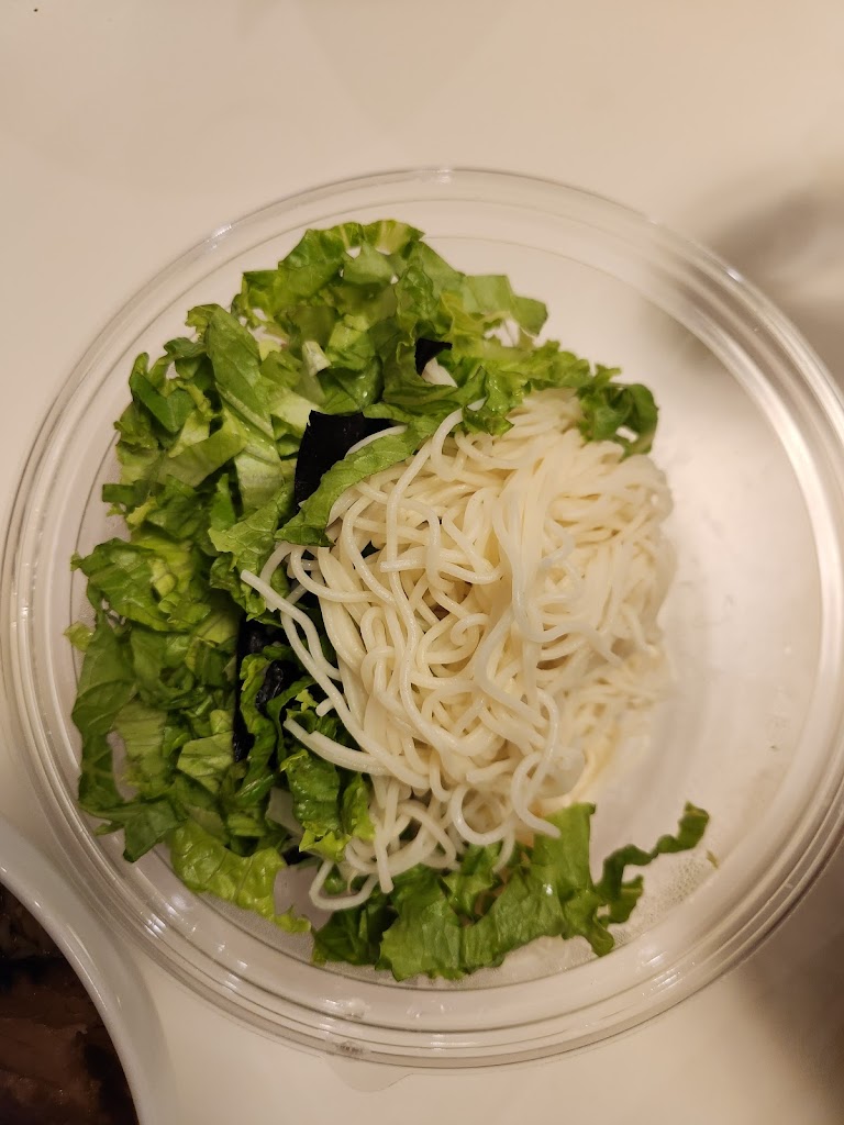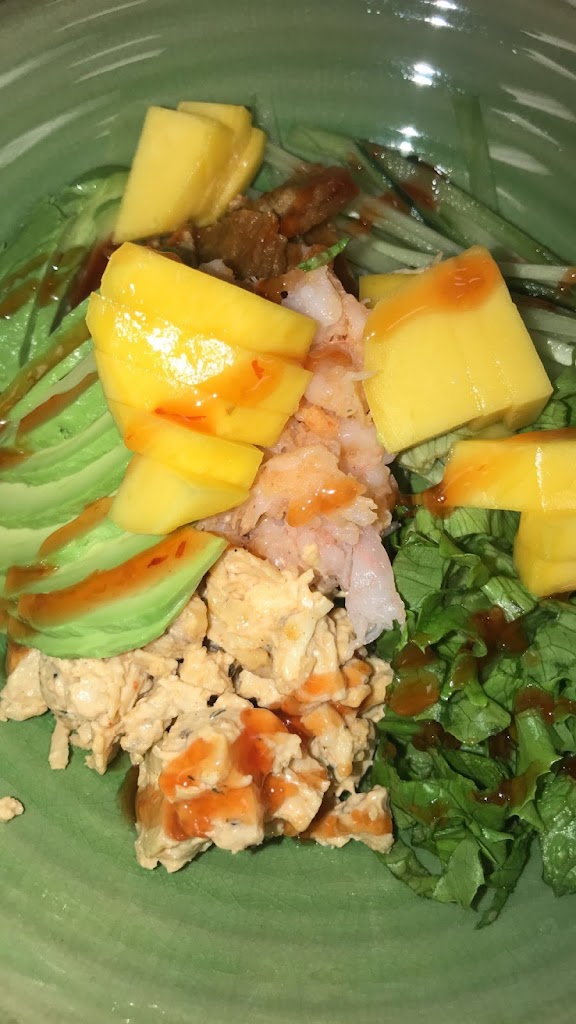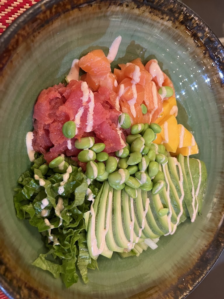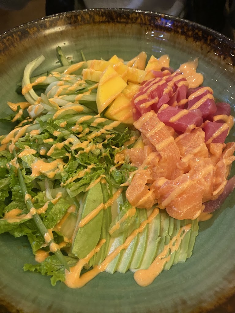 tuna salad, salmon salad, mango, avocado, cucumber, lettuce, edamame, green onion and spicy ponzu sauce.