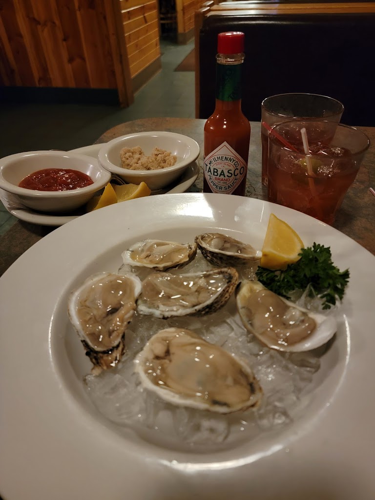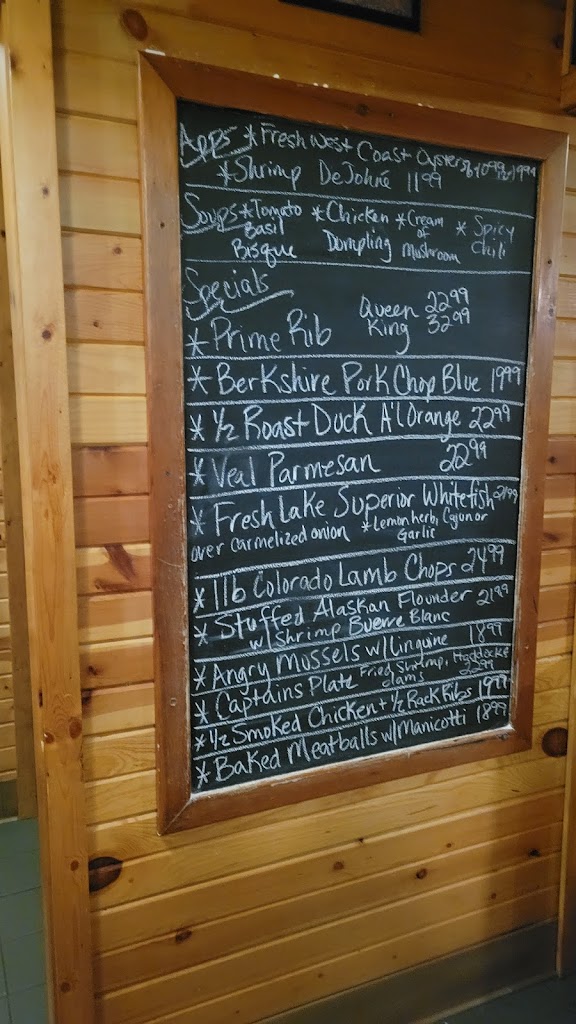 The atmosphere and food were excellent. We enjoyed delicious drinks at the bar before dining. The cabin-like setting is very comfy. After perusing the menu, we ordered a couple of the specials. There was quite a a variety of specials to choose from. We had teriyaki chicken wings for apps, an order of the crab stuffed rockfish with shrimp, and the pork osso bucco. All were cooked and seasoned to perfection! It was a great meal!