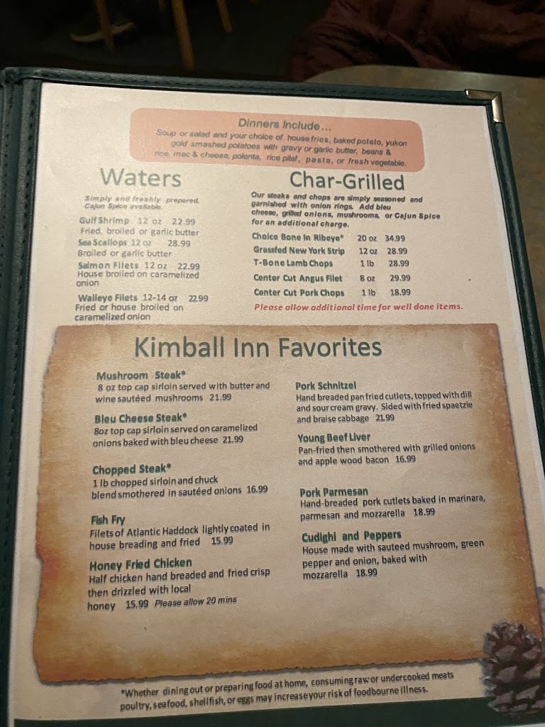 I ordered the prime rib and the Beef Barley soup. Both were amazing!! My husband is a really good cook and we are not super impressed by restaurant food too often. We highly recommend the Kimball Inn though!! Their prime rib and soup were the best food I have had in a long time! The “Queen” size prime rib was huge too!! The service was really wonderful as well! We had the sweetest waitress. We will be sure to visit them again the next time we are in Hurley!