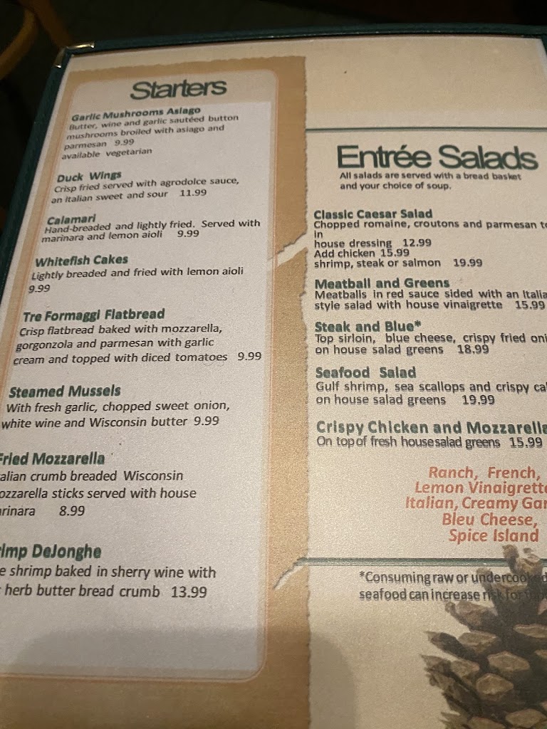 The food was excellent. We had chicken alfredo, whitefish & haddock with shrimp. Everything was delicious. Service was a little slow and our table was cold because we were sat next to the door. Overall it was a 5/5 because the food was delicious!