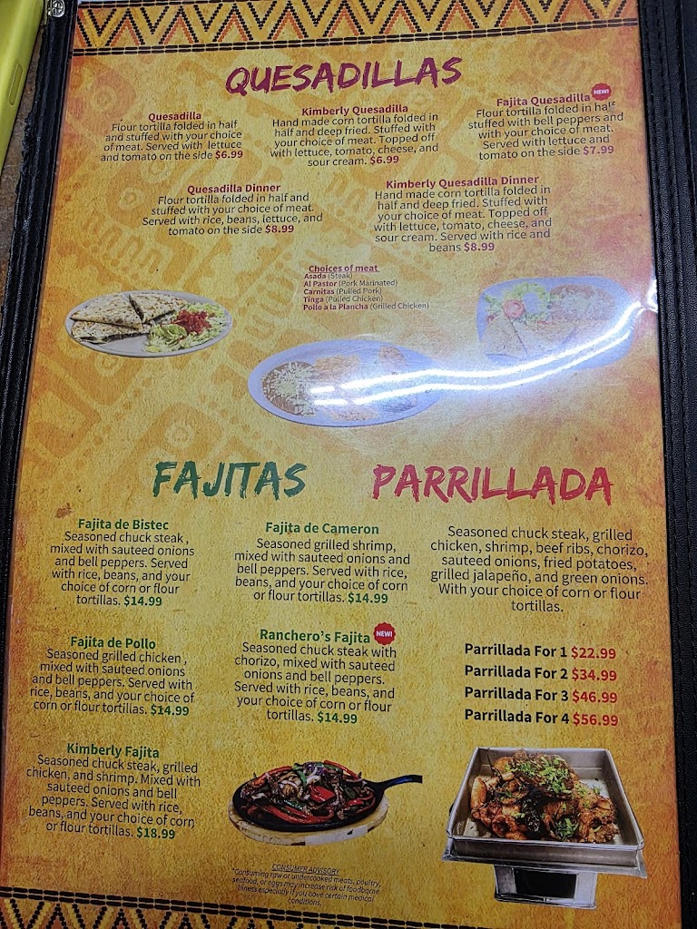 Kimberly mexican restaurant was an unexpected anc welcome surprise. For its location it was u expectedly authentic. The parrillada was amazing. The chicken was juicy, pulled pork was flavorful and the shrimp was cooked to perfection. Their flan and tres leches are a must try! Another recommendation would be the tamarind jarritos which was nostalgic of a Tamarindo when I had visited mexico. The drink elevates the experience.