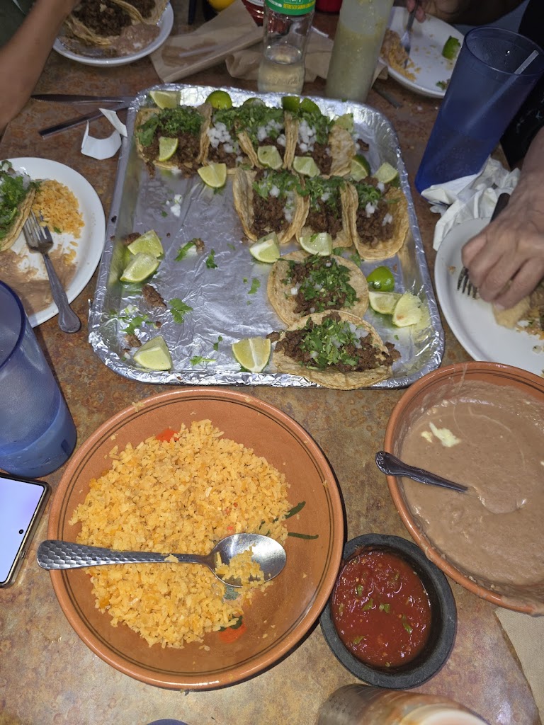 We ordered a 20 taco platter with hugh rice and bean bowls along with picture of Horchata and other drinks. Bill came out to 125. We were a party of 6. Steak Tacos were made well with flavor we just got the basic cilantro and onions. Beans and rice where ok. The family said the Horchata was tasty.