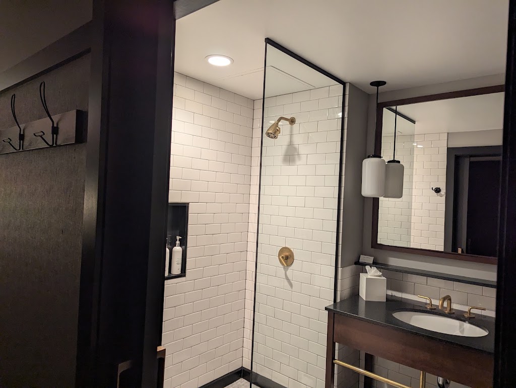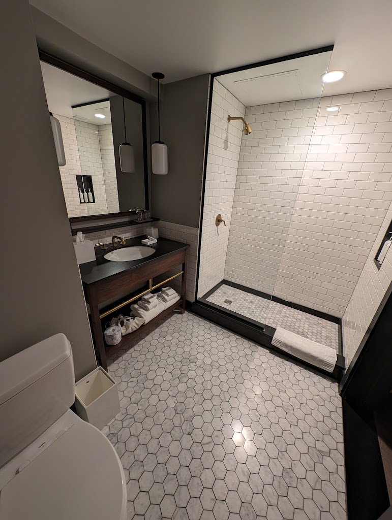 Excellent service, great location and okay rooms. Check-in was a breeze, the front desk people were top-notch and my room was not bad, but for a luxury hotel, not exceptional either. Comfy bed, good pillows and a great nicely laid out and modern bathroom helped mitigate that somewhat, and — bonus —- there’s a happy hour downstairs in the lobby every evening at 5. Nice! The amenities are proper, with a well equipped fitness center (weights, treadmills , machines, etc) and the rooftop bar is pretty sweet as well with a dim, loungey sexy vibe.