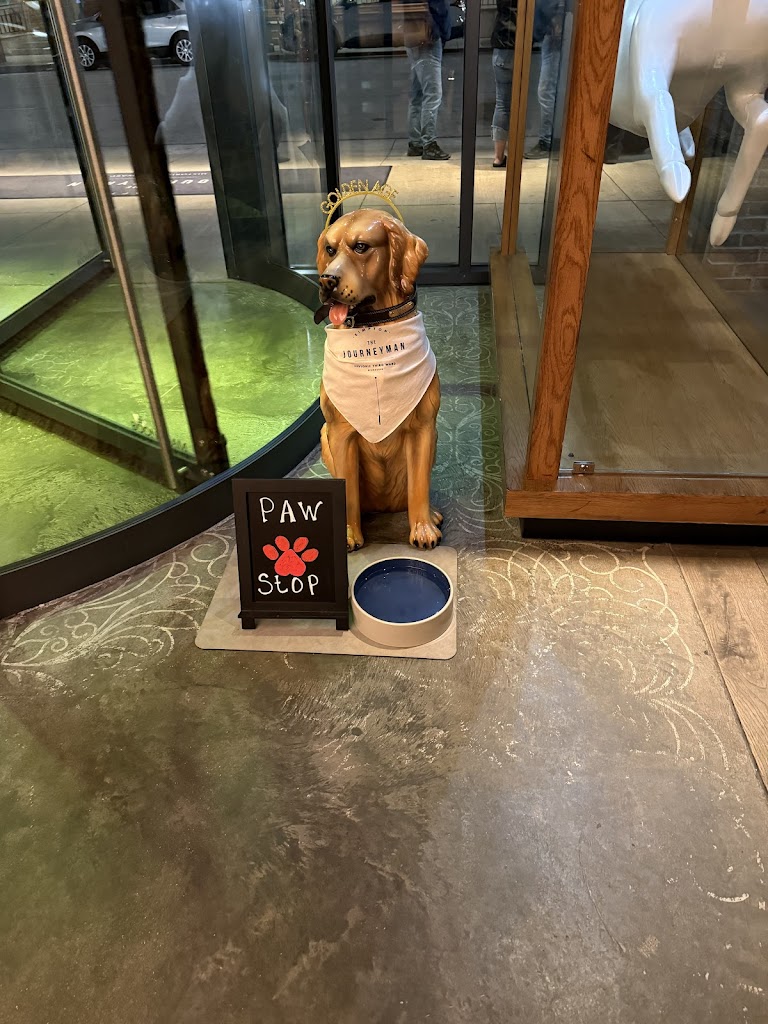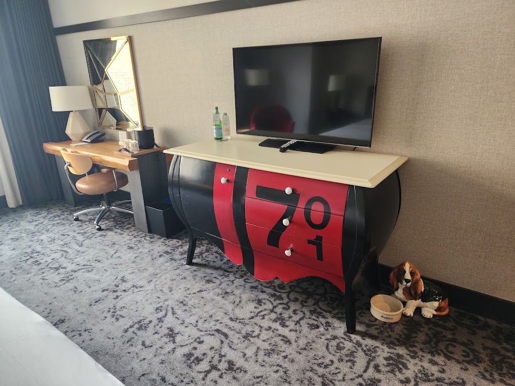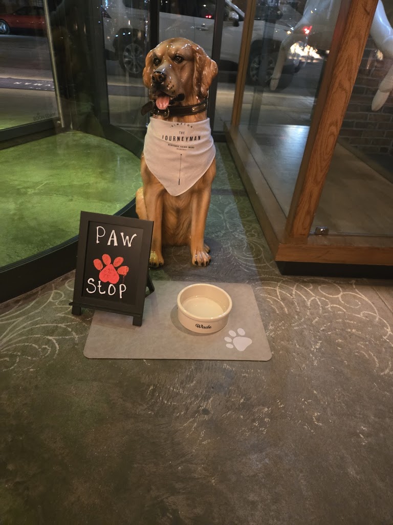 We thoroughly enjoyed our stay here. The location was perfect and everyone was very friendly. The room was clean and the bed was extremely comfortable! I loved that it's dog friendly and all the little dog statues and water bowls. We felt very safe and liked that the elevators have card access to room levels. I would highly recommend!