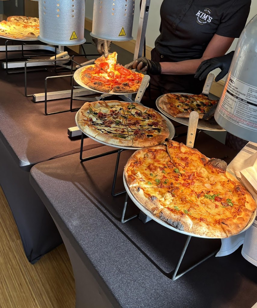 Kim's food, most importantly the pizza is AMAZING. We've gone there both to eat as a family and also held our wedding rehearsal dinner on Kim's patio. There service was phenomenal and the food is always so good. We also booked their pizza truck (which is glass so you could see them make the pizza in their own wood fire pizza oven in the truck- SO cool) at our wedding. Their pizza was the talk of the wedding (especially the truffled mushroom pizza) and we still get family and friends that bring up how good it was. Kim was such a joy to work with and so accommodating to our every need. So if your looking for a bite to eat or a great catering partner, Kim and her team are the place to go!