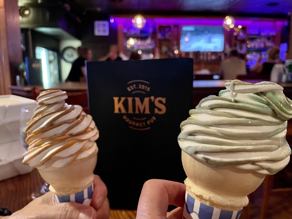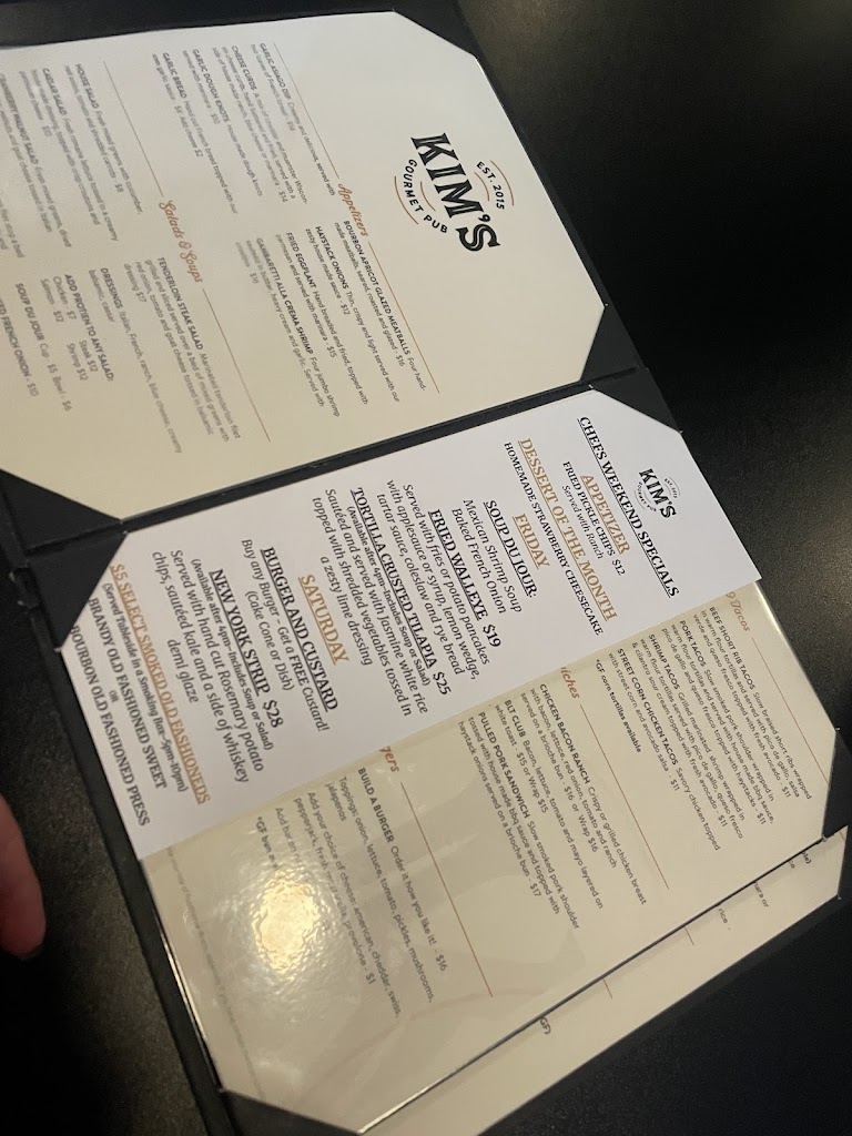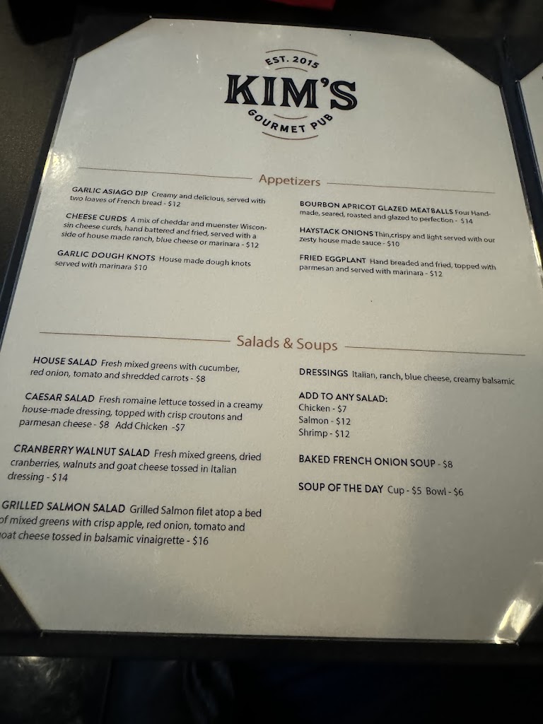 A friend from work kept saying Kim’s is a go to spot. Took a friend and her daughter to the wrong Kim’s… the service was great as were the drinks. My burger was amazing but the steaks had strange gravy and one came out over cooked. They gave us some complimentary treats and my burger came with a very tasty custard. The pickle chips and chips could be crispier.