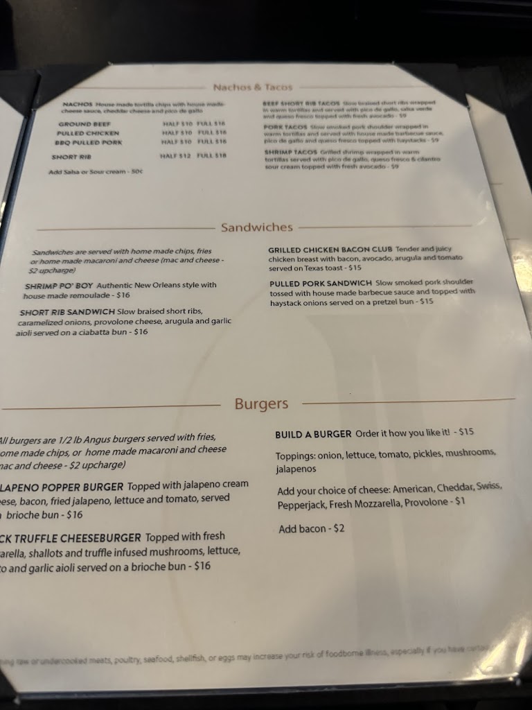Had a great late lunch here. We were greeted by a friendly and helpful host who seated us on the patio at our request. We ordered various drinks, nachos, burgers and dessert. All were very good and even though we were the only people seated outside, our server was very good and attentive. Even the host checked on us. Such a good time, we'll definitely be back!!