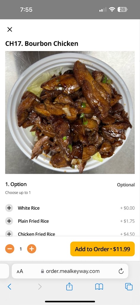 Asked for White Rice upon ordering. Got my order and got Chicken fried rice,my Wife doesn't like Chicken Fried Rice,(that was the reason for ordering White Rice) went to the counter and brought it to their attention! She informed me that they were going to have to charge me! I told her that I specifically ordered White Rice but WHATEVER!! I was not happy and went away from the counter in a huff and other customers knew I was not happy!! Needless to say she finally did bring me out White Rice and didn't charge me!! This place has kind of gone down hill since they opened!! Kind of not a fan of theirs anymore!!☹️☹️