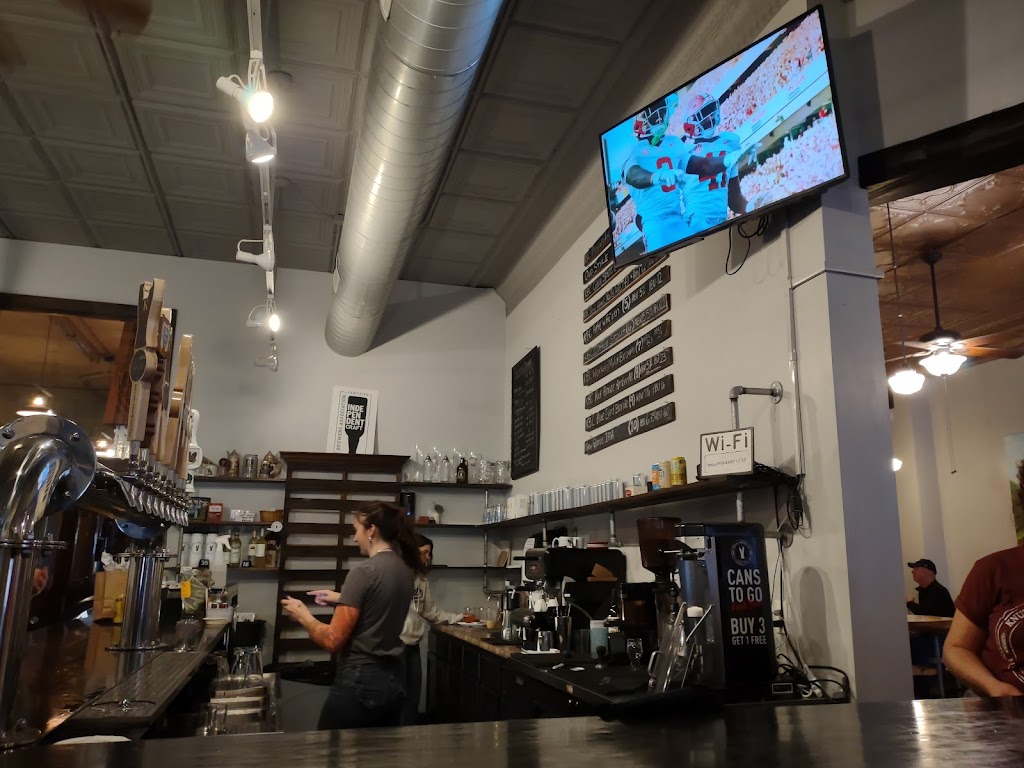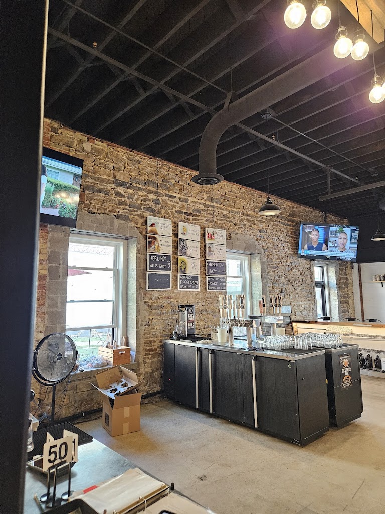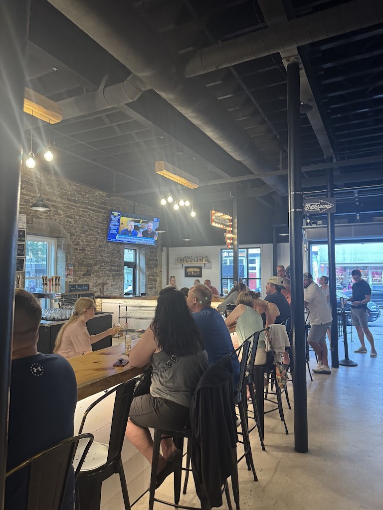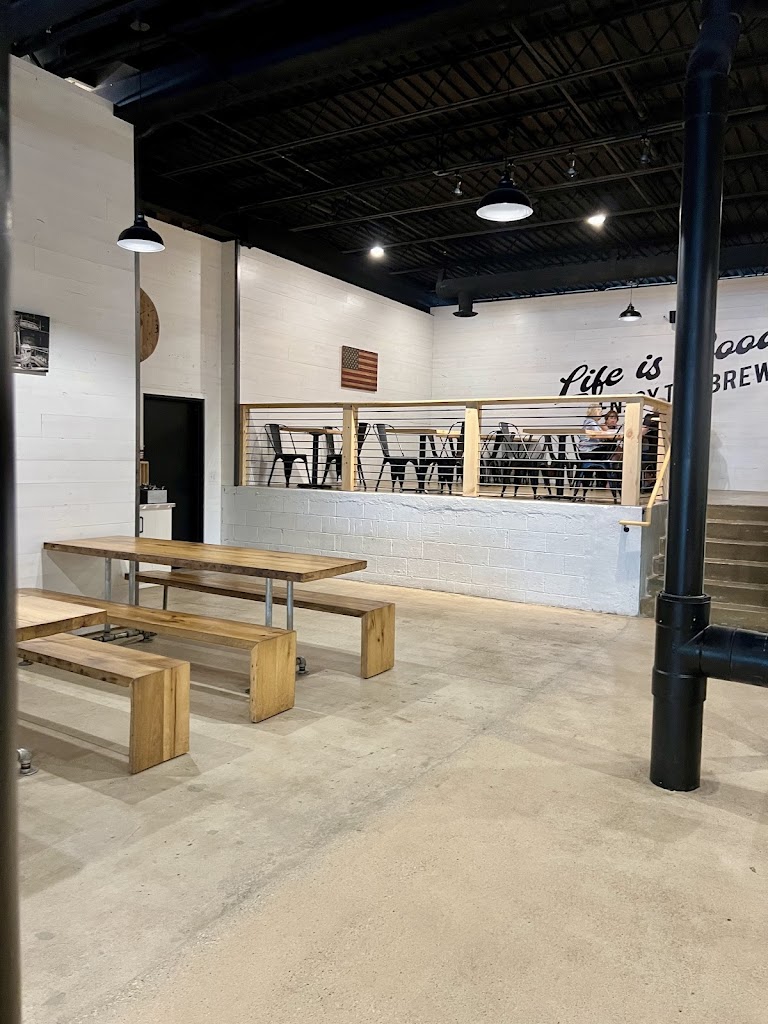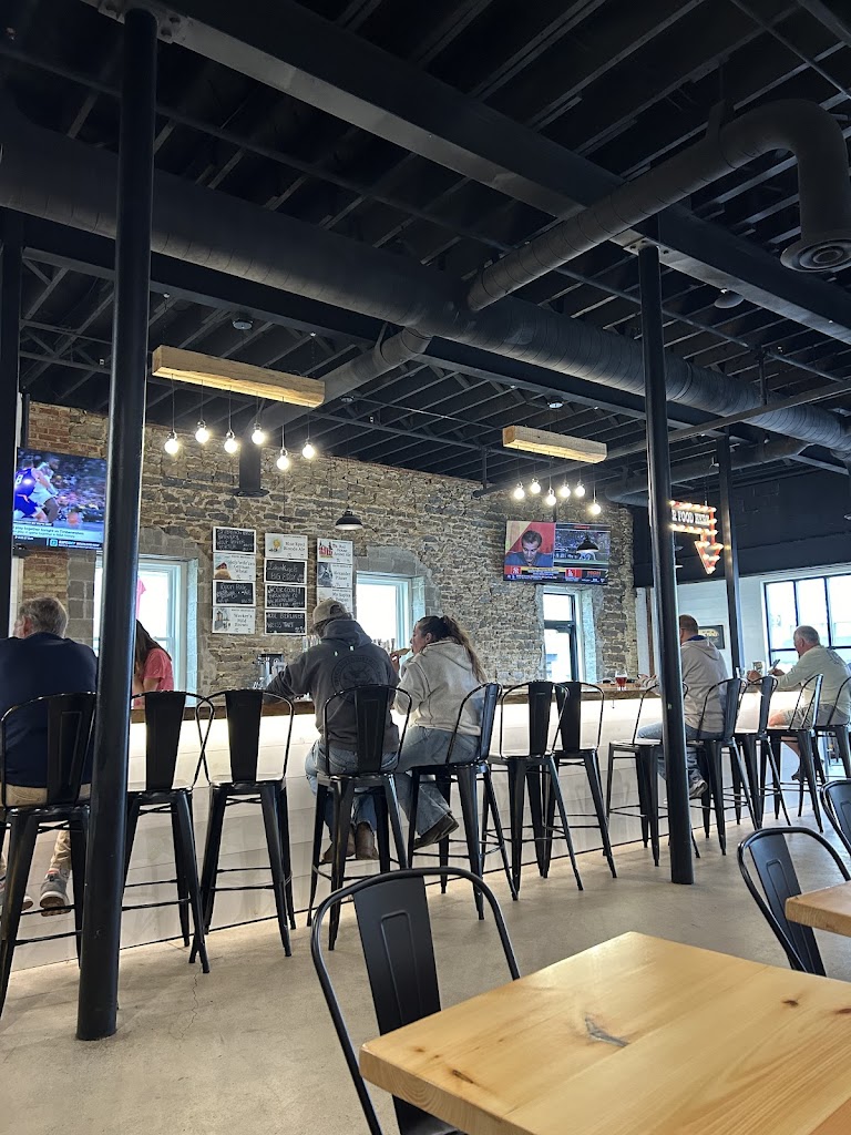 The taproom is modern, well-lit, and has comfortable and spacious seating at the bar.