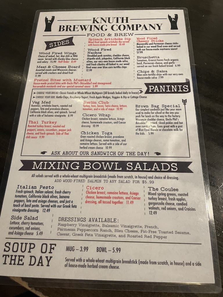 Knuth Brewing Company is a really great place to go. The atmosphere is really good with the brewing equipment to view. The staff is upbeat and friendly. The food is great!!! They have wonderful carrot cake!!!