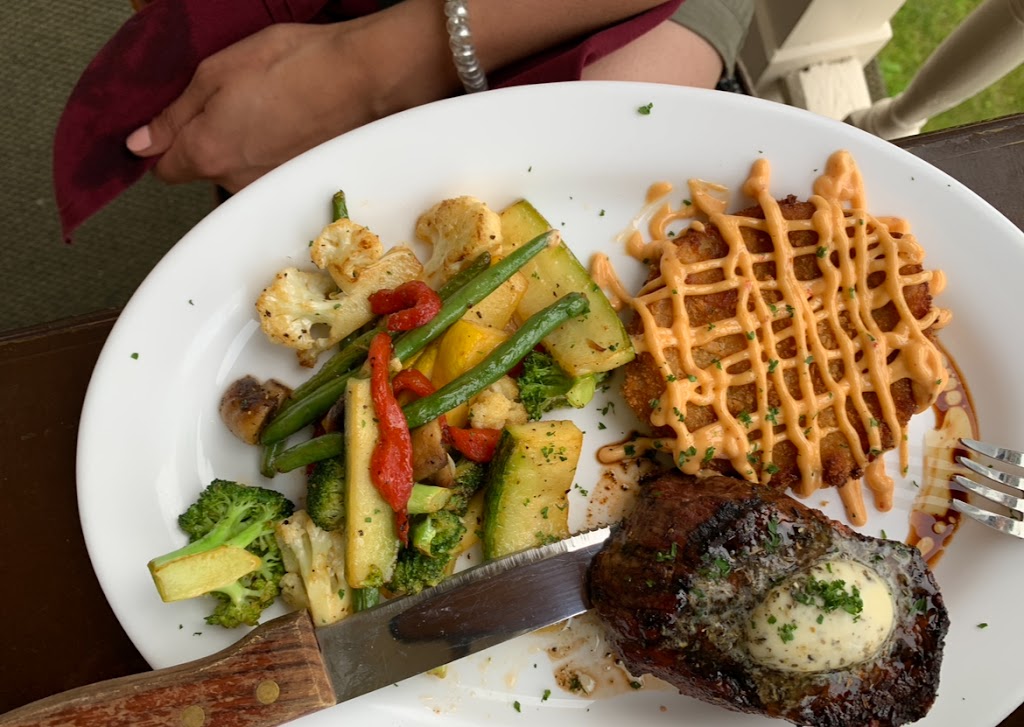 Neat location, service was great. We both had steak with veggies. The steak cuts were definitely low grade for the tenderloin and the New York strip. The veggies were delicious though! All and all, decent and the prices were on par for what we got.