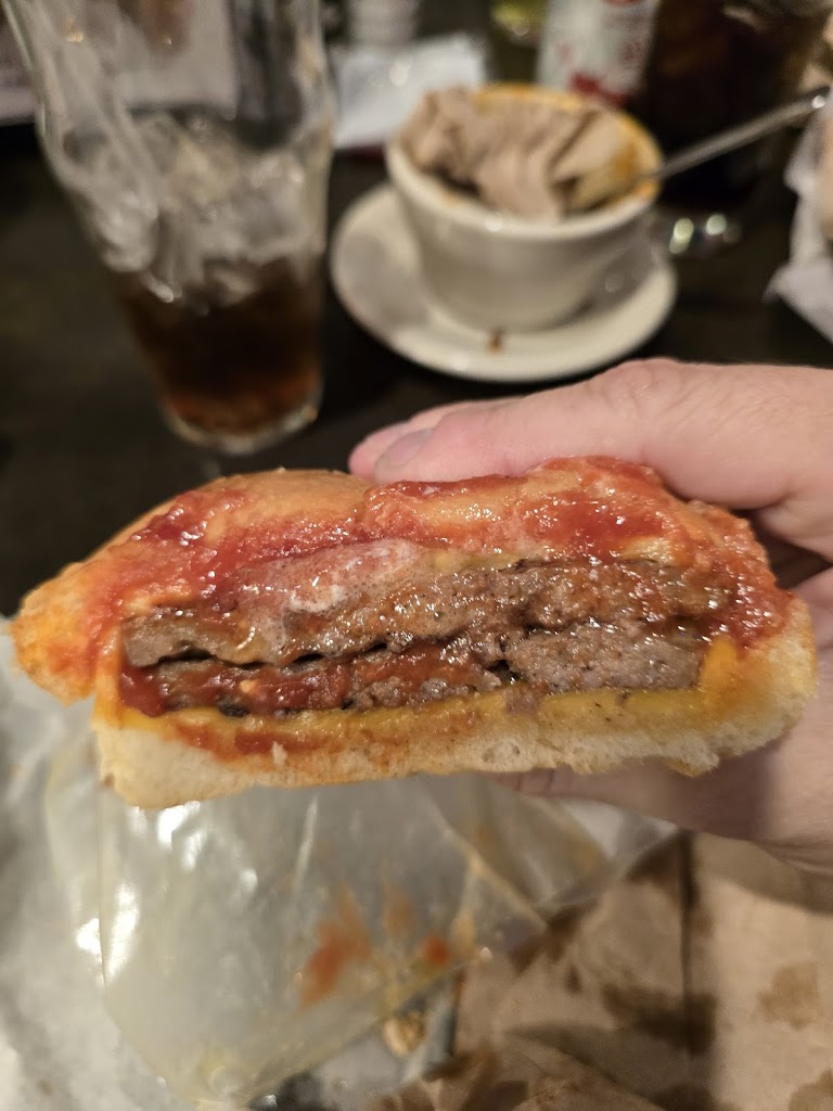 Cheeseburger with everything on and a cup of chili, no spaghetti. (It still confounds me that you have to ask for it to be without spaghetti. Spaghetti should not be in chili. Perhaps that's the New Englander in me, but when in Rome... ). Very tasty.
