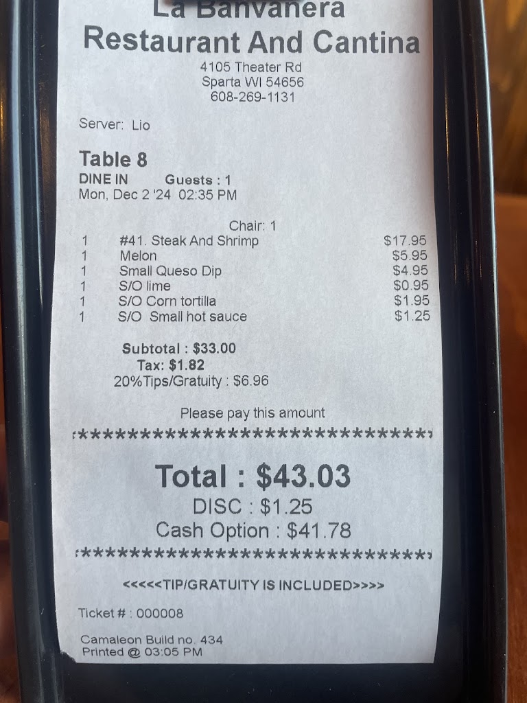 Server was very friendly. Food was good, it's your typical Mexican restaurant.