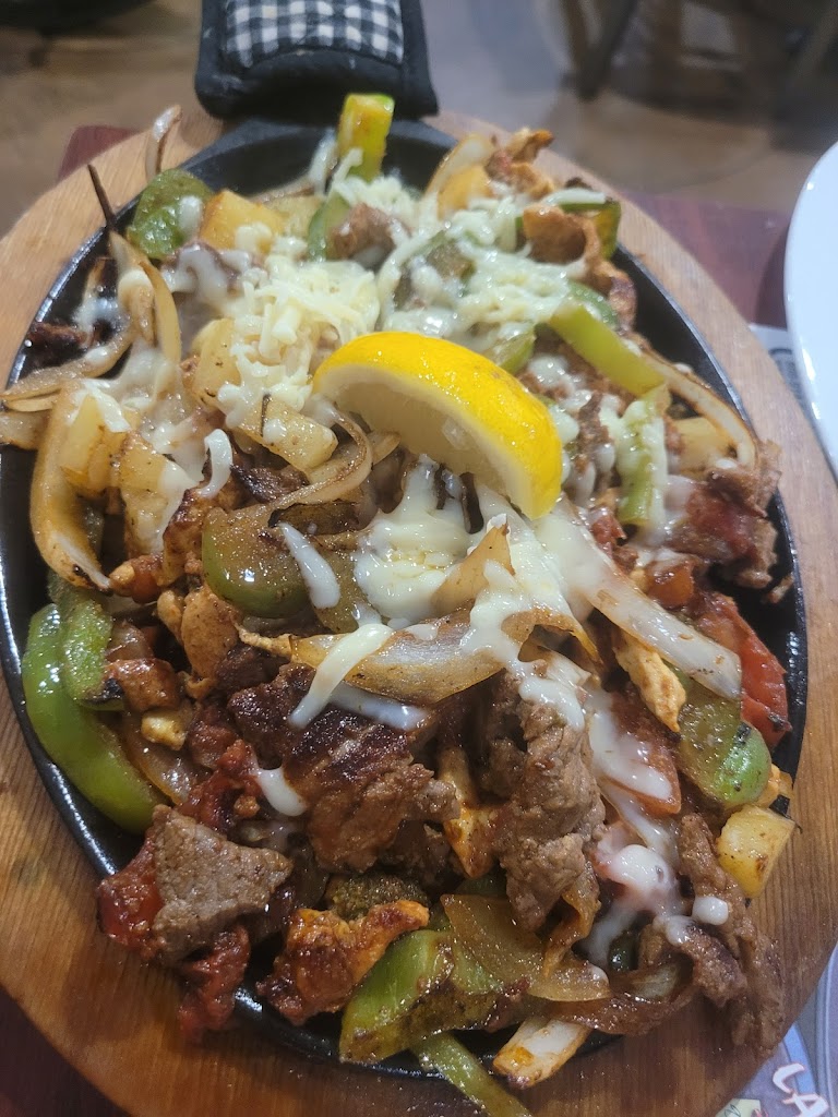 Fajitas has almost no meat a lots of onions and green peppers but hardly any meat and burned