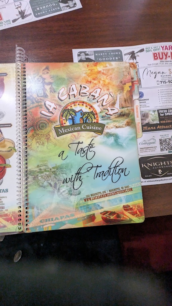 La Cabana Mexican Cuisine provides affordable authentic fajitas, molcajetes, chimichangas, taquitos mexicanos, quesadillas, burritos, enchiladas, nachos, soups, and salads to the Marinette, WI area.