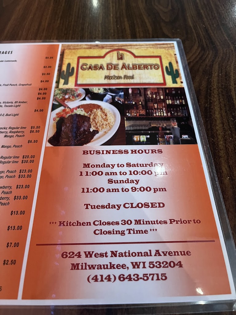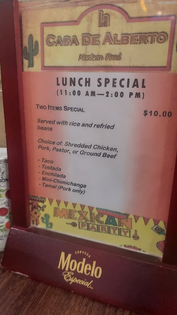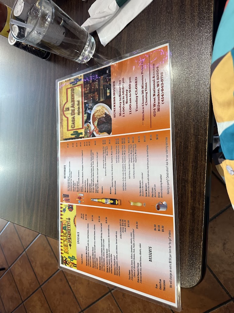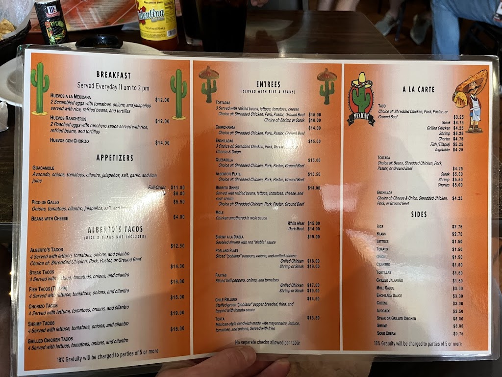 Food is always great. Staff is friendly. Great value. Alberto’s Plate and Quesadillas are favorites.