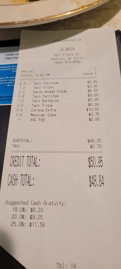 If your idea of a Mexican restaurant is brightly painted furniture, pinatas hanging from the ceiling and velvet paintings on the wall, La Penca is not for you. If however you are looking for some of the best authentic Mexican food you will ever taste this place is definitely for you. The location is rather off the beaten path and the exterior appearance is nondescript and the interior is just a ordinary space with tables and chairs, but the service was excellent and the food outstanding. I had the Pollo Supreme and was surprised at the number of shrimp that was included along with the chicken. I don't expect to be back in Madison anytime soon but if I were I would definitely eat here again.