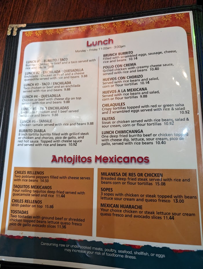 Peach Margarita was the perfect strength of tequila. Salsa was creamy and the right amount of bite. Got my food in less and 10 minutes and wait staff is friendly. Food was consistently typical of this restaurant type