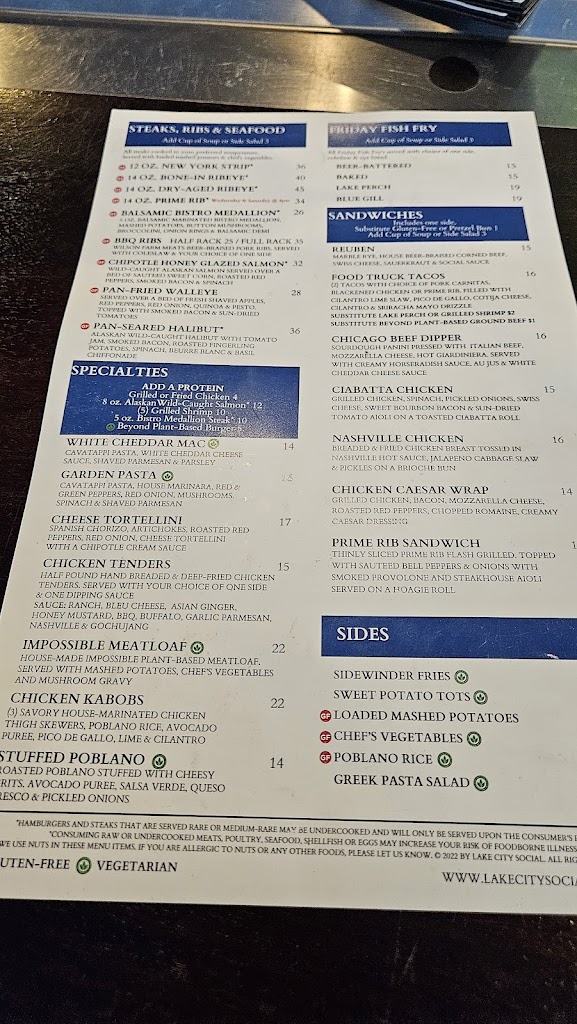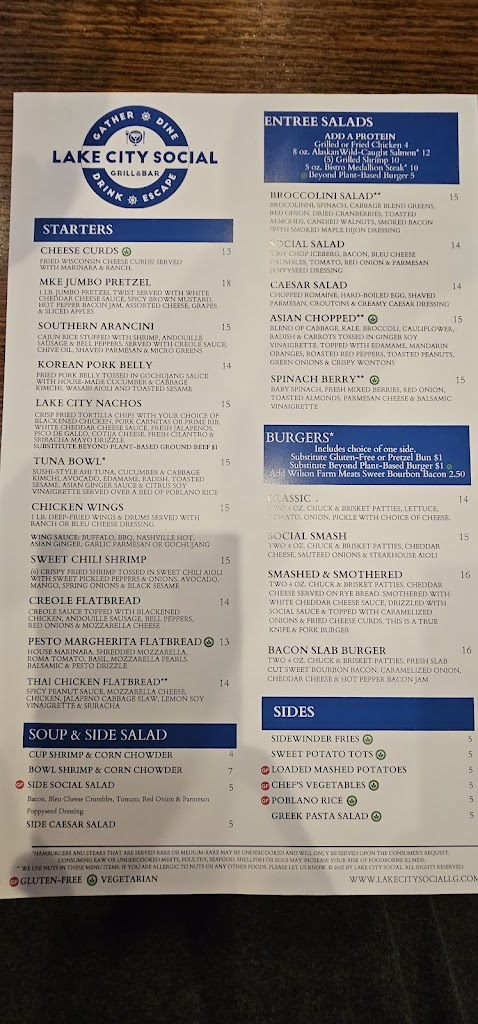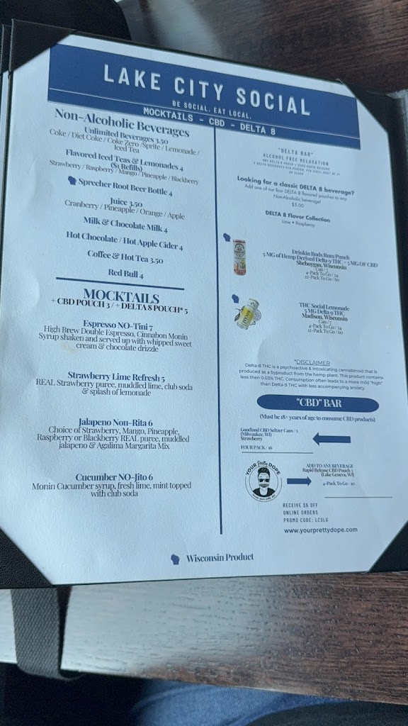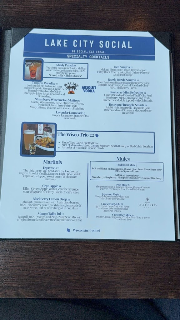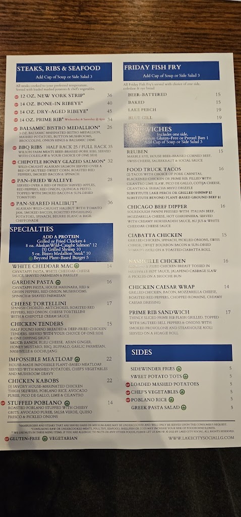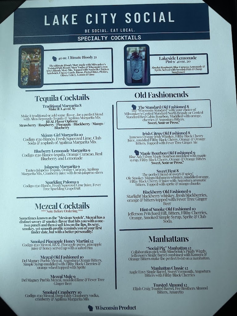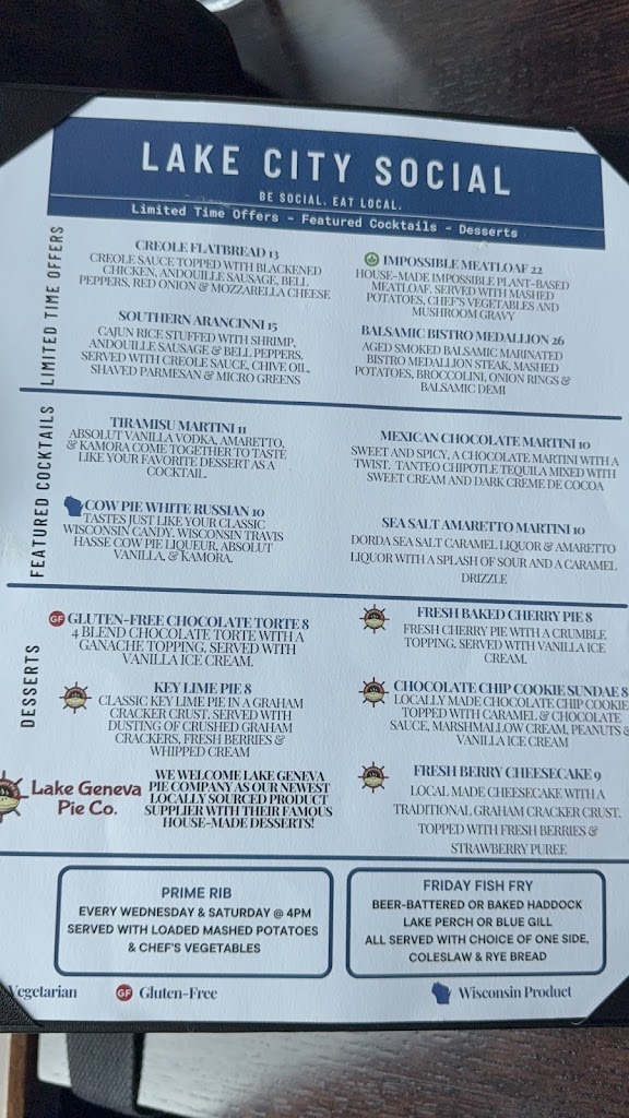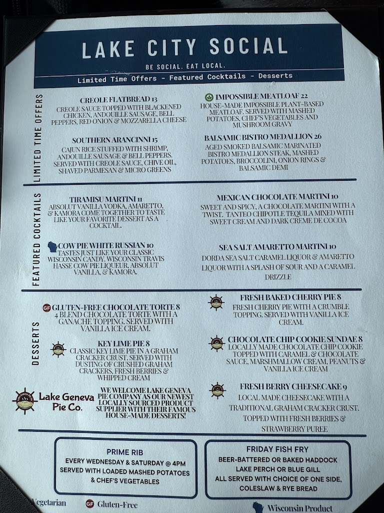 Located in the heart of bustling downtown Lake Geneva. We focus on fresh, and delicious comfort food with our own little added modern twist. Featuring burgers, ribs, pasta, seafood and steaks along with some unique, cravable appetizers & kids menu. Our spacious dining area is comfortable and inviting for all of your dining needs. We are family friendly with private & semi-private space available for business meetings or life's celebrations with friends and family. Our bar area is a popular gathering spot and we offer a wide range of craft beer, cocktails, wine and creative mocktails as well. We are locally owned and operated and take great pride in our communities and the people we serve from both near and far. Welcome to Lake City Social!