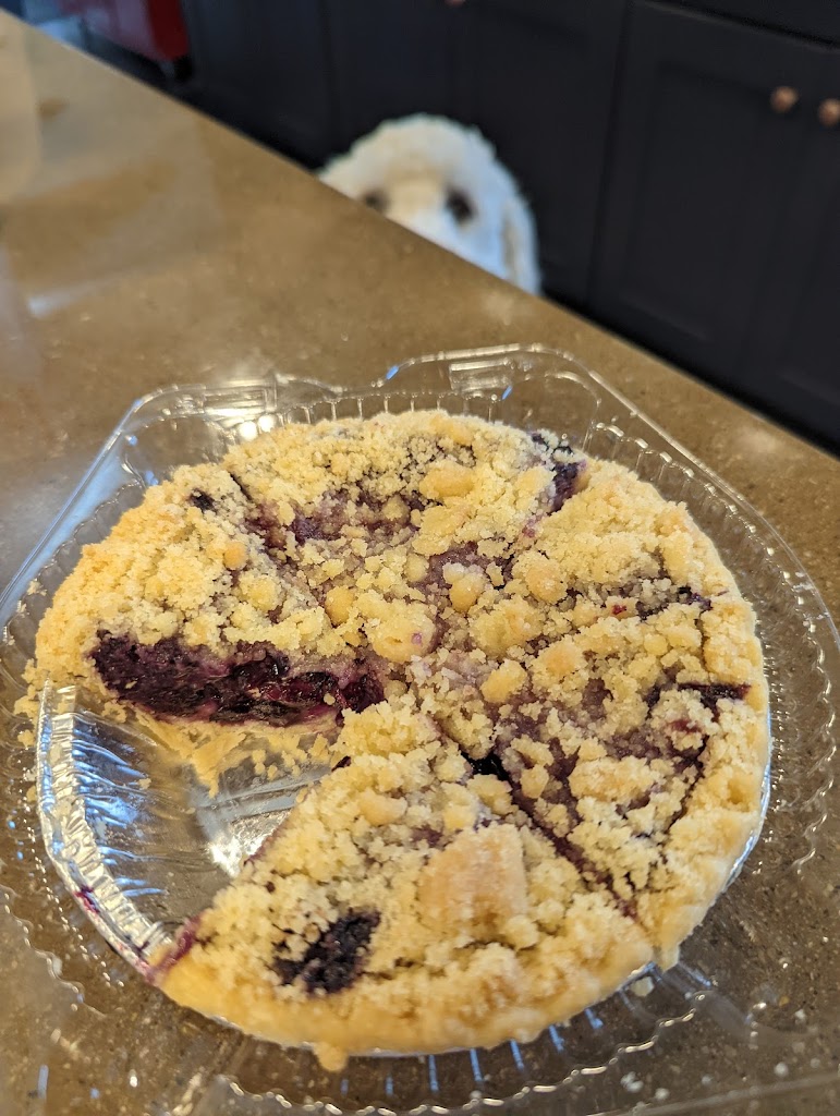 WOW WOW WOW The Blueberry Crumble Pie is absolutely insane. I bought lots of yummy treats from here and everything was outstanding. I purchased some slices and also a few take and bake items. I baked the blueberry crumble pie when I got home and I regret not buying 10 more. The owner was so nice and we got to pet her sweet pup. Cannot wait to go back
