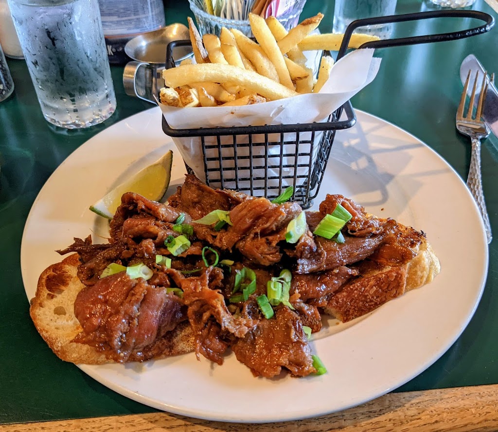 Friendly staff, cozy interior and tasty food! Had the open faced skirt steak sandwich and it was well marinated and very tender =d
