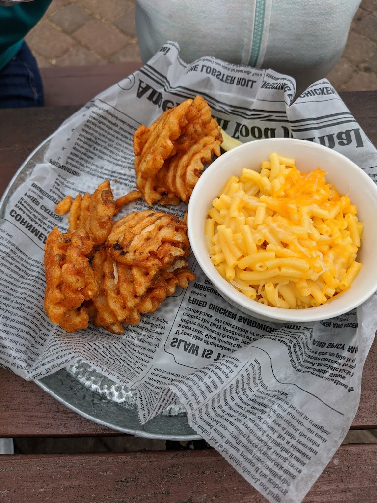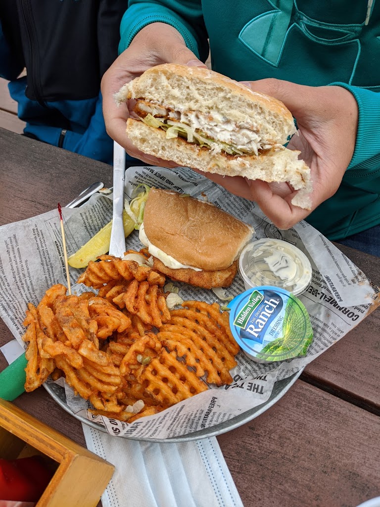 Pros - The food was phenomenal (I had the Mahi Sandwich), especially the fries and sweet potato fries; the lake views are gorgeous; fun outdoor games to pass the time. Food came out fast.