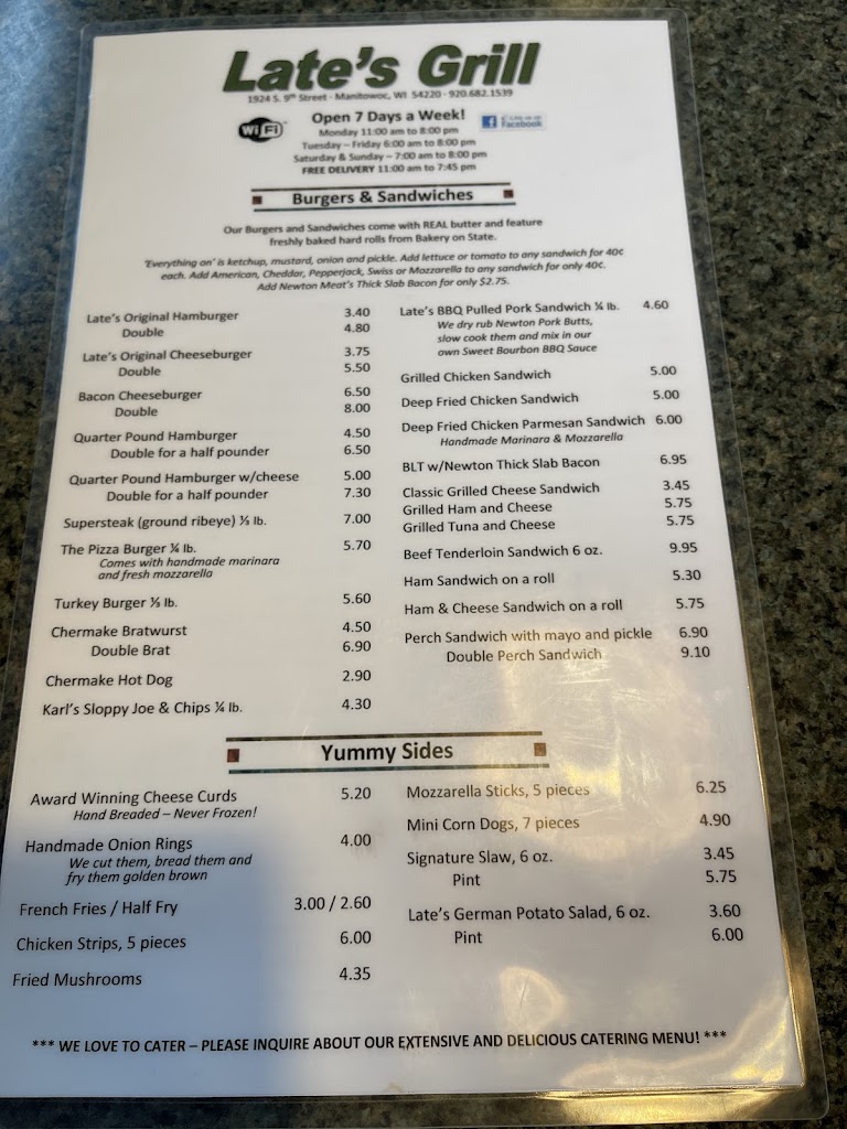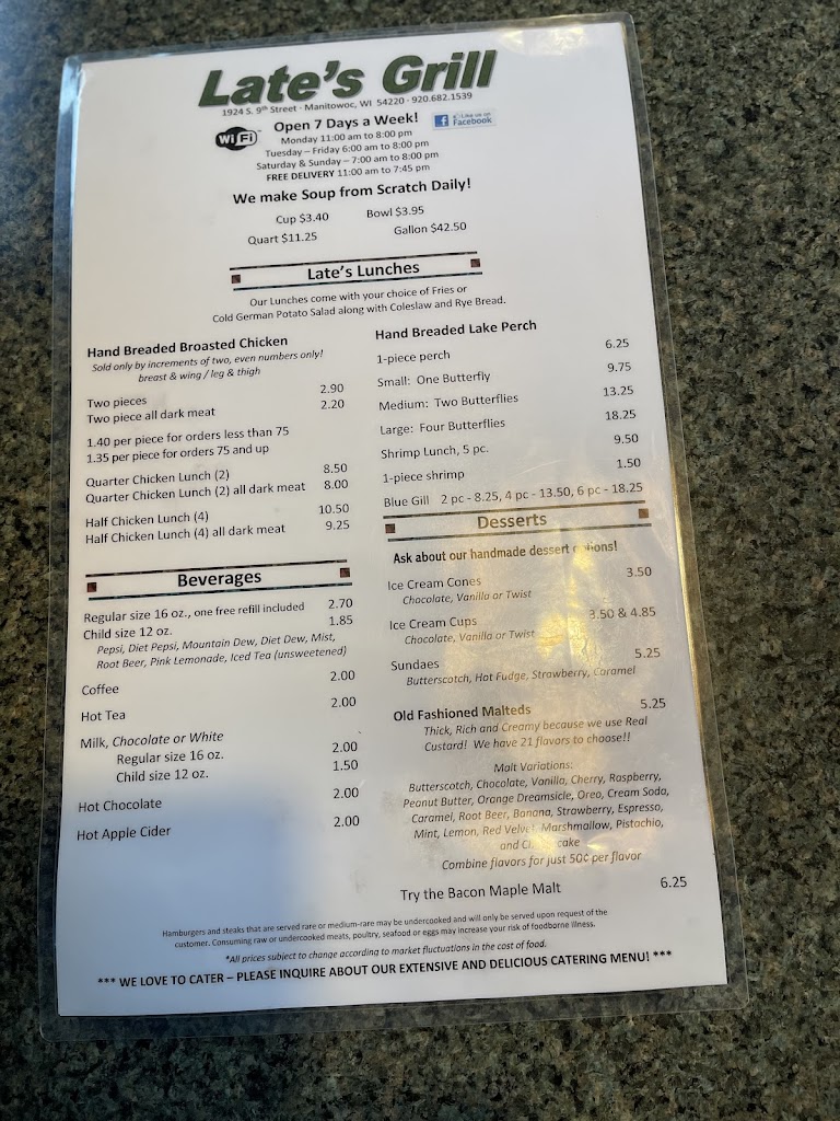 What a wonderful little place! Myself and a group of college students went up to Manitowoc for the Hamilton Wood Type Museum and hit up Late's on the way home. Fantastic diner food for a great price! The malt selection was fantastic as well!!