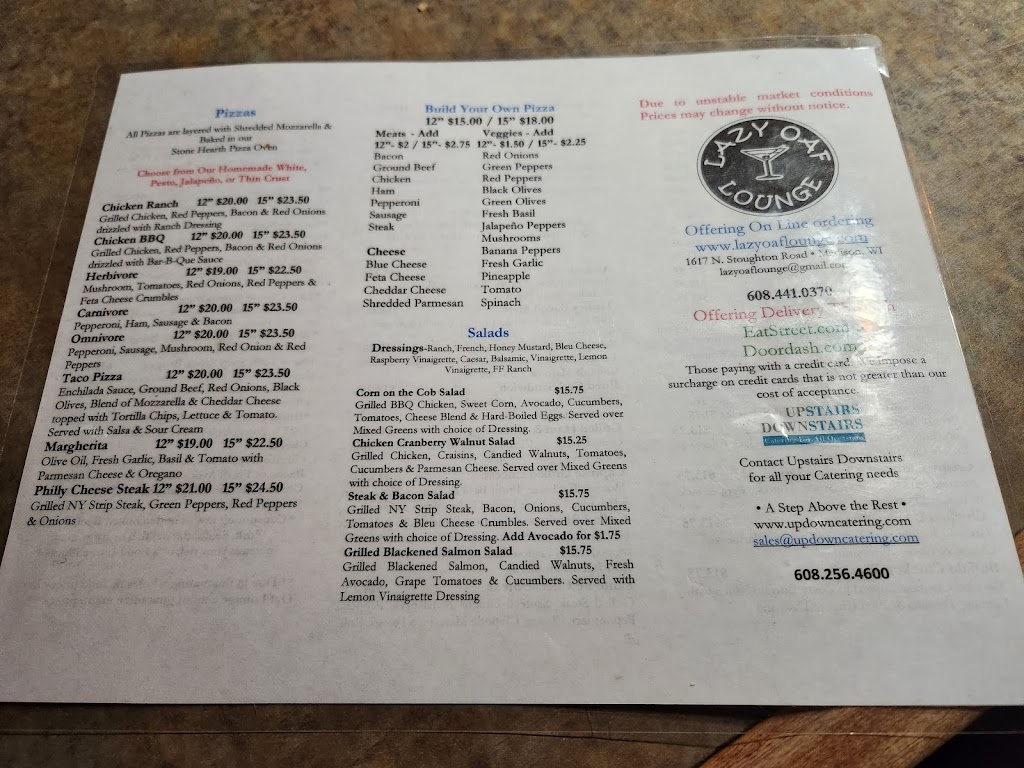 This is a fun, relaxing, jeans and a t-shirt kinda experience! If you've been craving a large, old-fashioned, juicy, made to order, delicious pub burger, look no further. Or try one of their tasty salads or brick-oven baked pizzas! I didn't have a chance to jump into their beer menu, but am looking forward to that on my next visit. Because there will be a next time for me, to just hang out, (maybe on their Friday night fish fry?) with a friendly, neighborhood crowd, chatting and laughing and maybe just being a little bit of happy in the inclusive atmosphere of the Lazy Oaf.