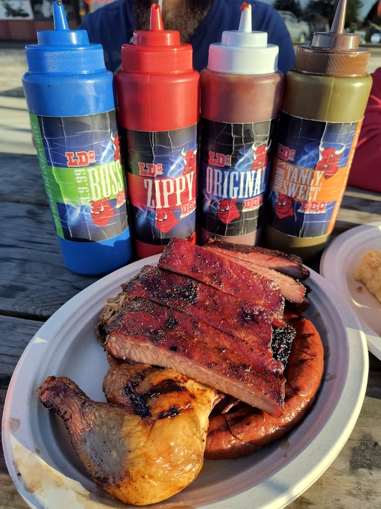 I was in the area looking for a place to eat when LD's caught my eye. The place was very busy and there was a long line to order, but I was pleasantly surprised to see the owner chatting with the customers (he's a funny guy too!), giving out free refreshments/beer to thank us for our patience. I ordered the Original Sampler along with some banana pudding. The chicken was deliciously moist, the brisket slices were a good size and seasoned well, but the stars were definitely the ribs and the spicy sausage that they make in house. Also, DEFINITELY get the banana pudding because even though I was pretty full, it still tasted absolutely delicious. Aside from it being super packed (which is kind of a good thing), I don't see why you wouldn't stop by for some of the tastiest BBQ or food in the area! Definitely will be back again!